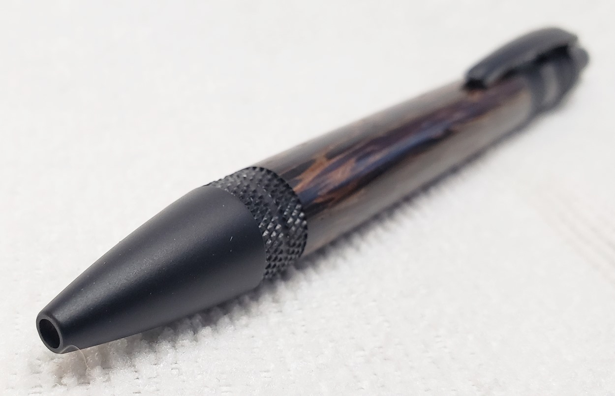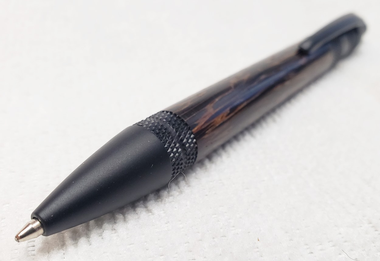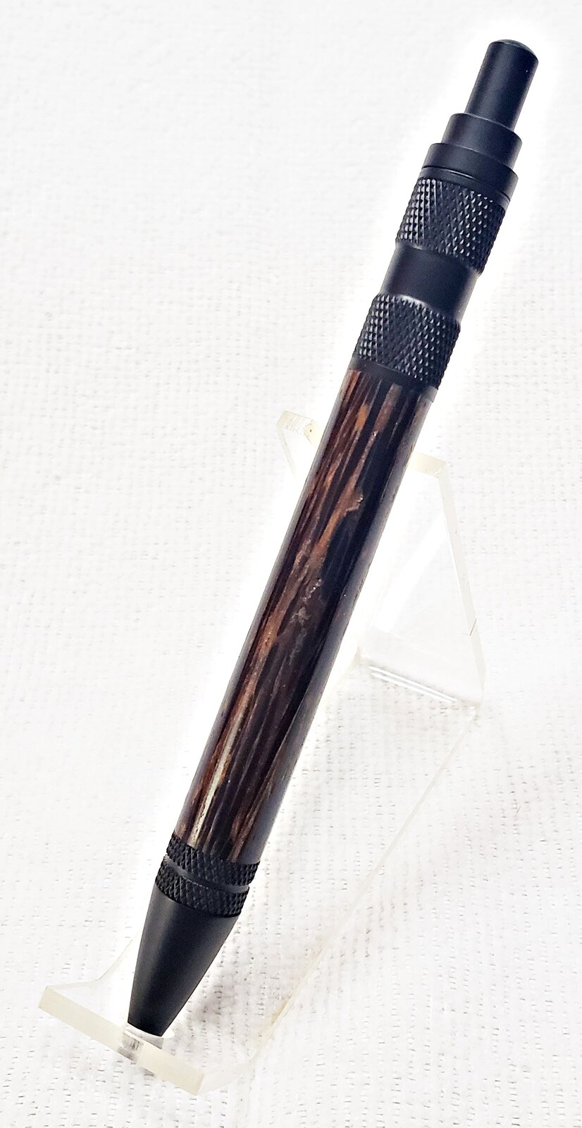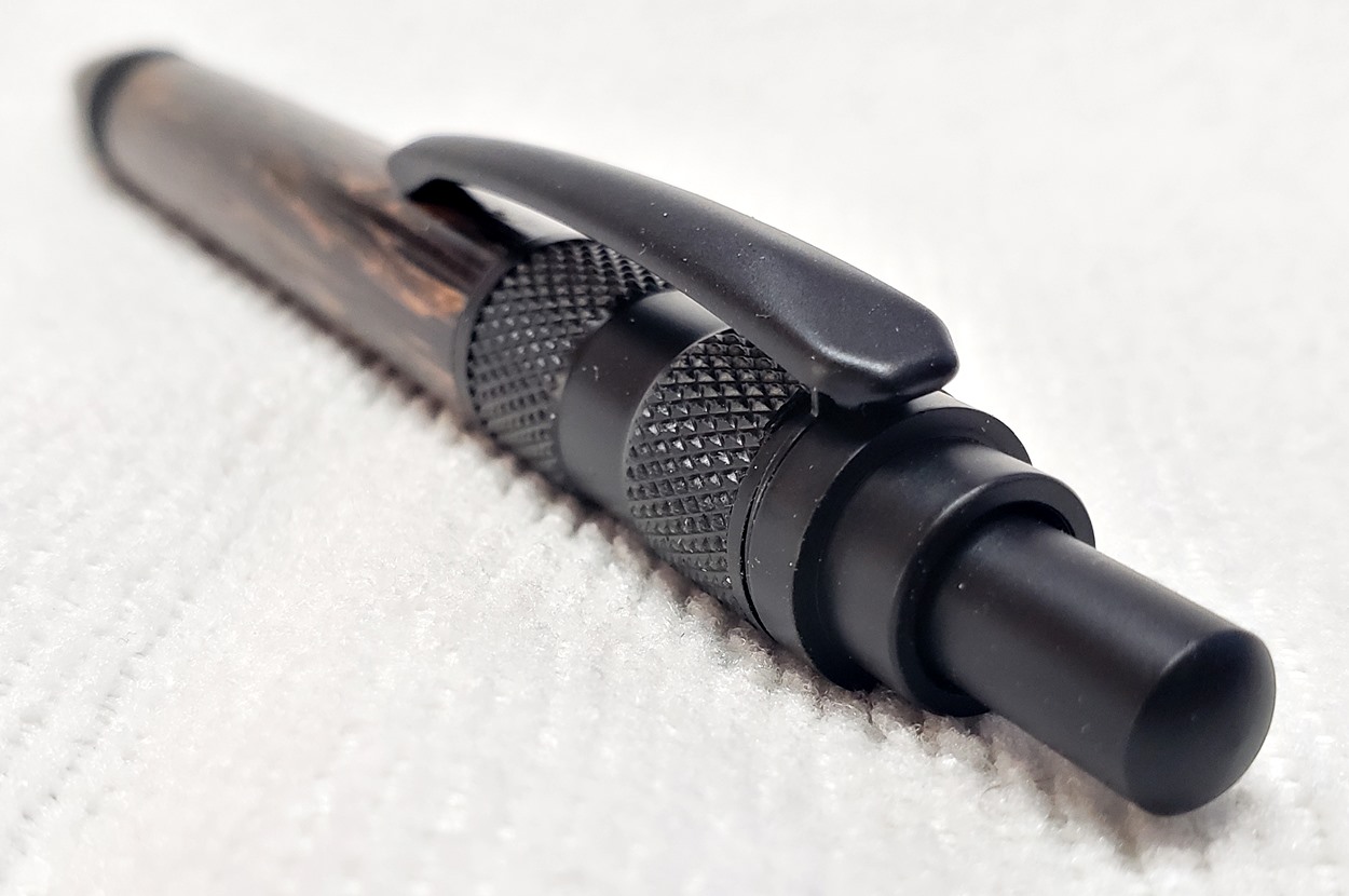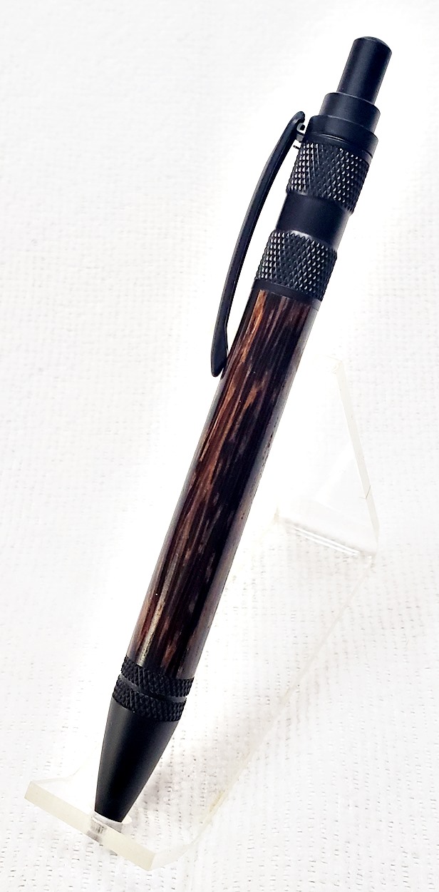 This is a Capital Click pen in matte black, from Woodturningz. I think it looks great with the black palm. I made it for my son, and he immediately put it in his pocket. Made me feel good.