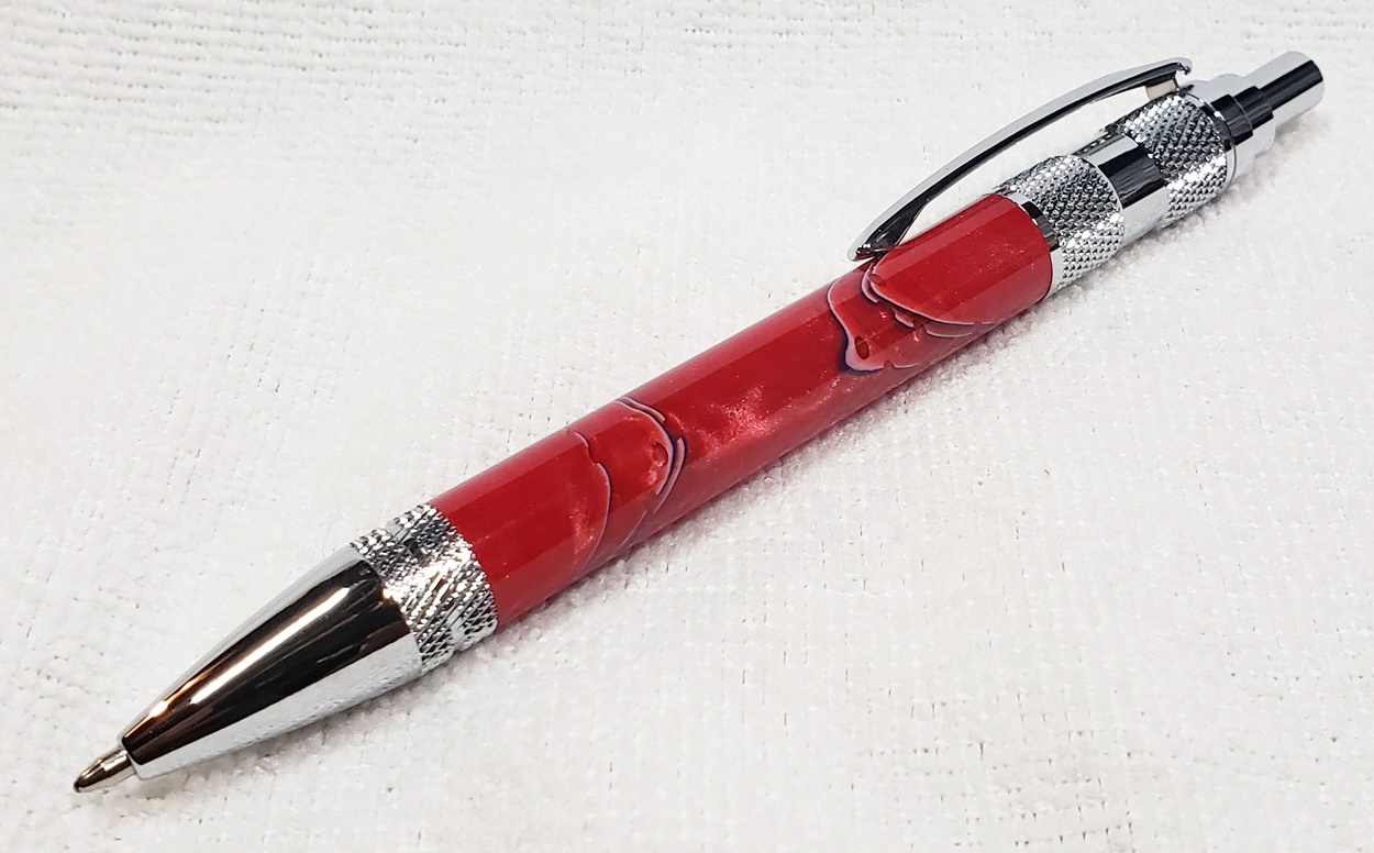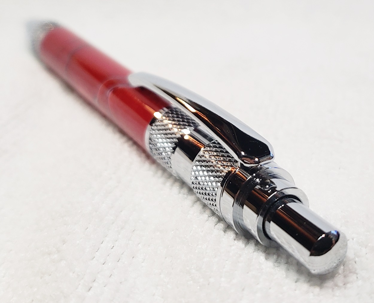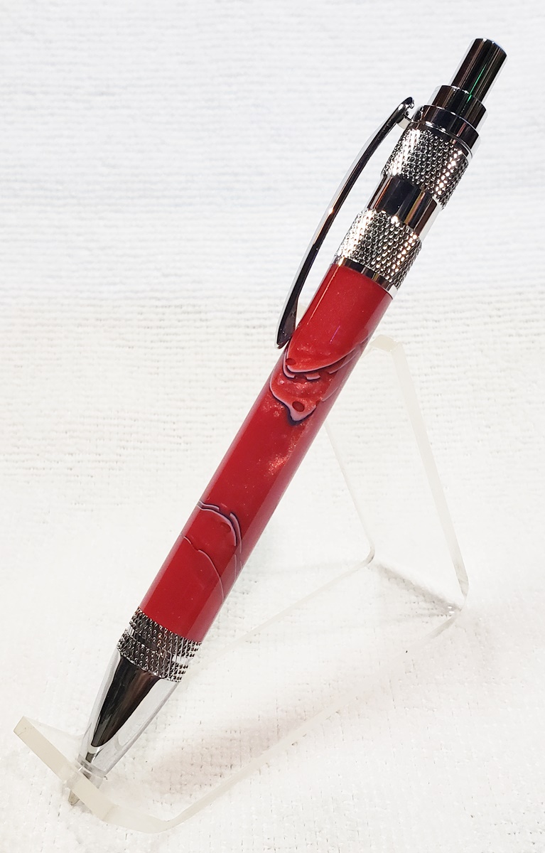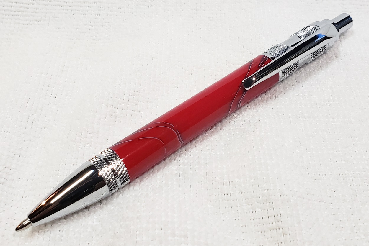 This is a Capital Click in chrome from Woodturningz. The blank is an AA called Strawberry Mesh, also from Woodturningz. The blank isn't very "meshy", but it is "strawberyie". Nice looking pen.