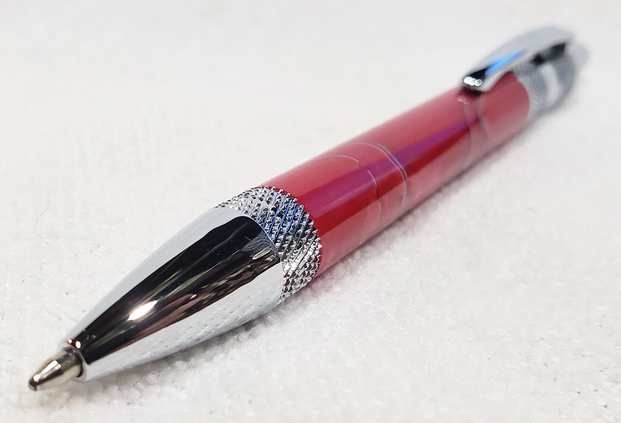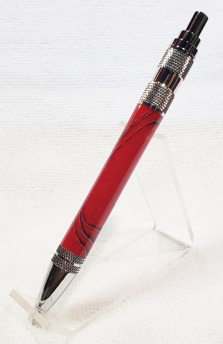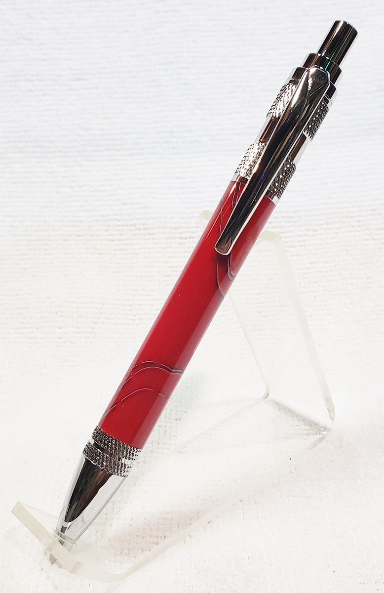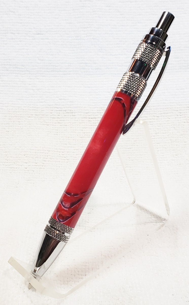 This is a Capital Click in chrome from Woodturningz. The blank is an AA called Strawberry Mesh, also from Woodturningz. The blank isn't very "meshy", but it is "strawberyie". Nice looking pen.