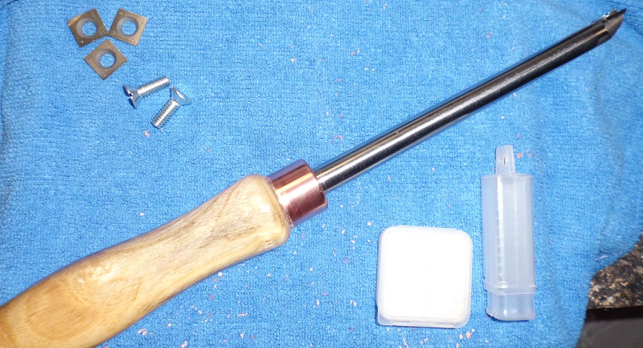 1 tool handle, with carbide bit and screw (there's a tiny chip on the corner of this bit, it'll wear away with sharpening eventually)