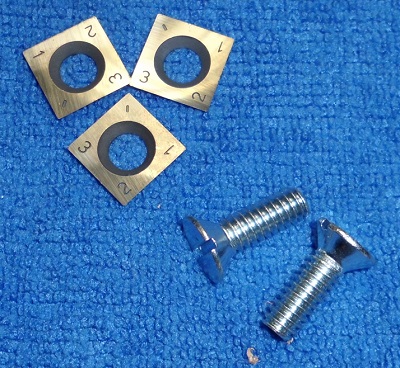 The screws are a tad bit oversized, in my opinion, but I can't seem to find smaller screws in this area of the size I need for these bits (center hole is 1/4" diameter). The bits were bought in quantity of 10, paid approx $2.70 per bit through Global Tools. 14mm square, .5mm radius corners (these are NOT the radius bits you are used to, they have SHARP square corners). As you can see from the pictures, everything on the blue towel is going to Eric. (minus the sawdust, lol ...)