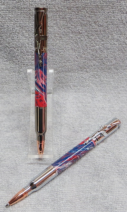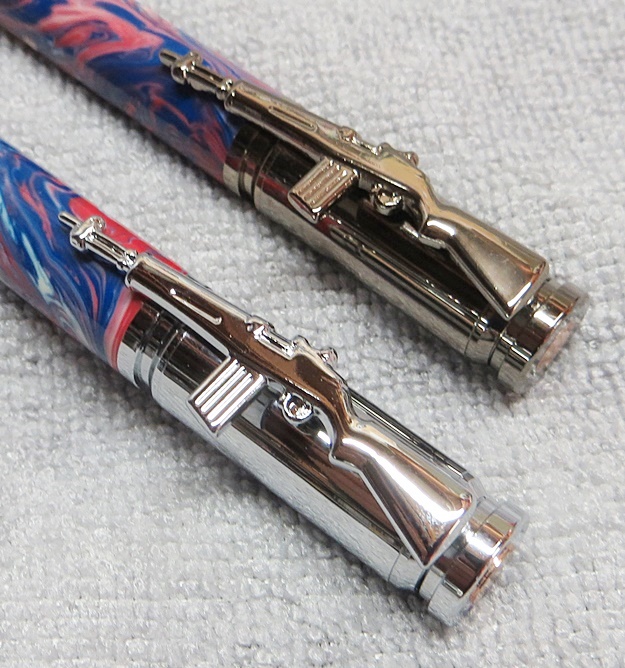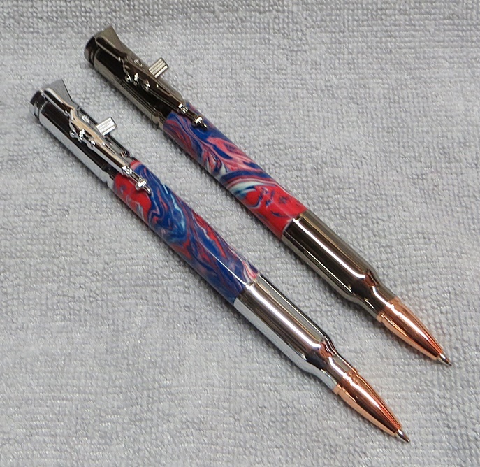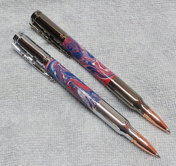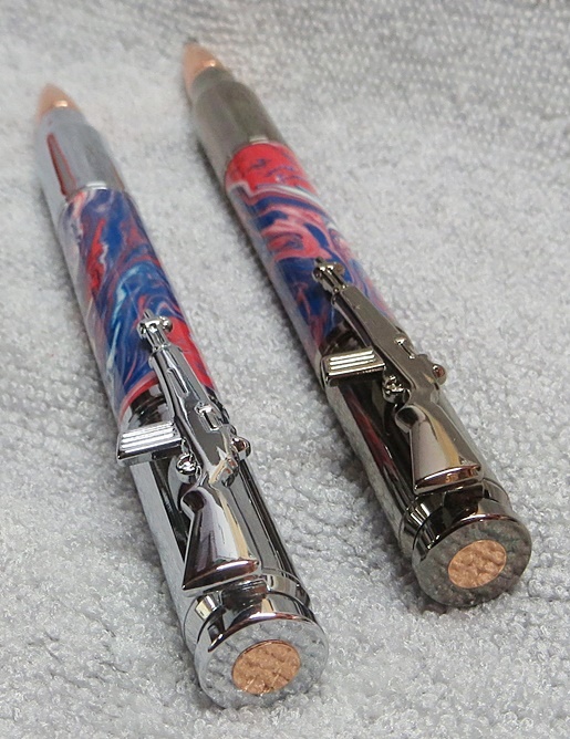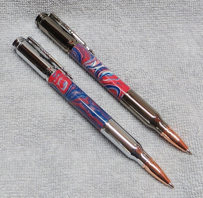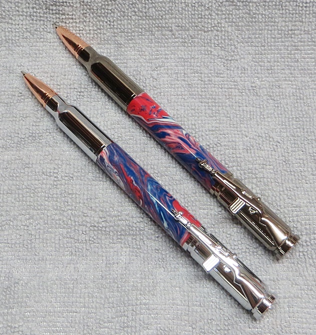 These are two Carbine pens from Berea, one chrome and one gunmetal. The blank is a Color Explosion from Exotic Blanks, called Patriotic Parade. I was able to get both pens from one blank. The blank was VERY soft, and turned easily, almost too easily. I almost turned the first one too far. I would have preferred it to be a tad bit harder. But still, it made some nice looking pens. I made these to donate to the Freedom Pens Project.