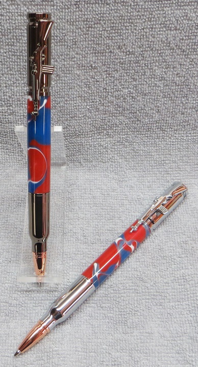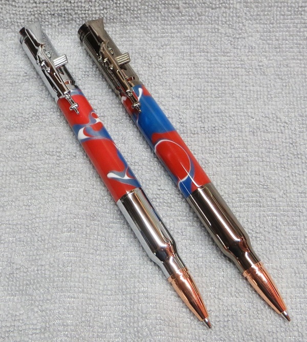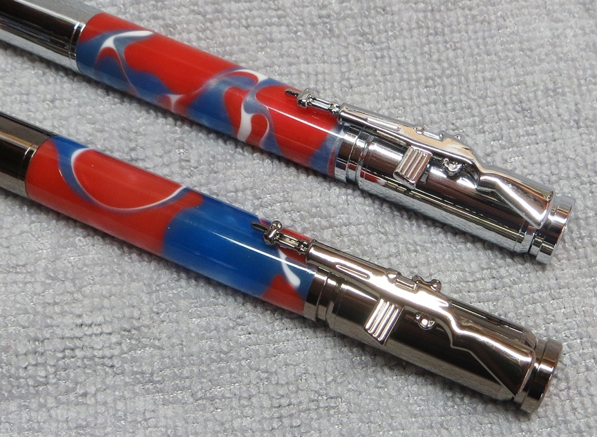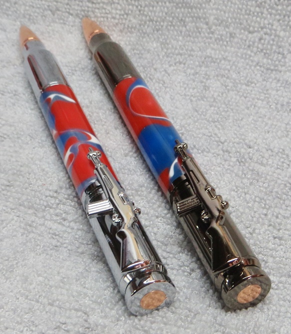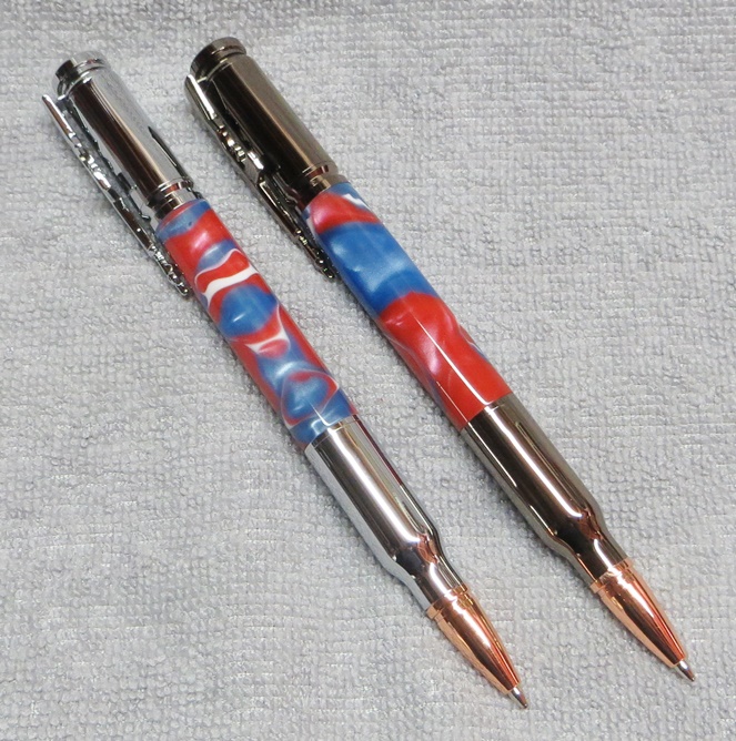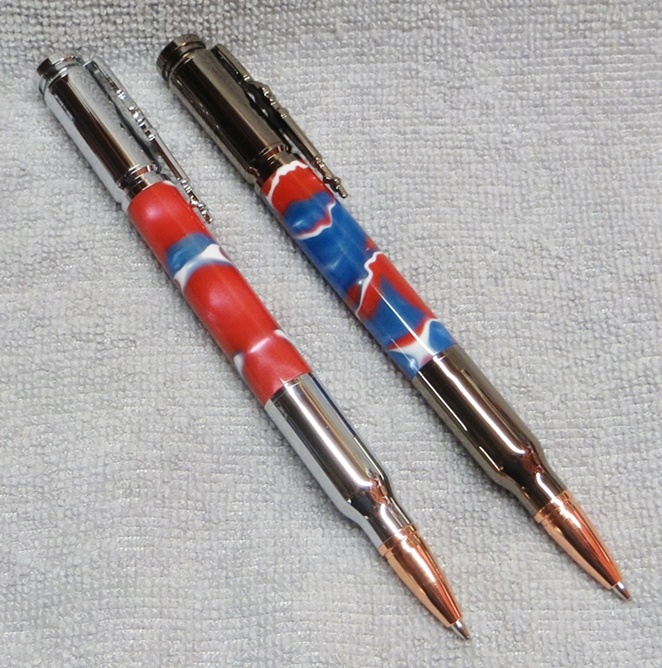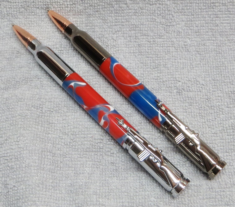 Two more Carbine pens for Freedom Pens. This blank is called Uncle Sam, also from Exotic Blanks. It was harder than the Patriotic Parade blank, but turned and polished easily.