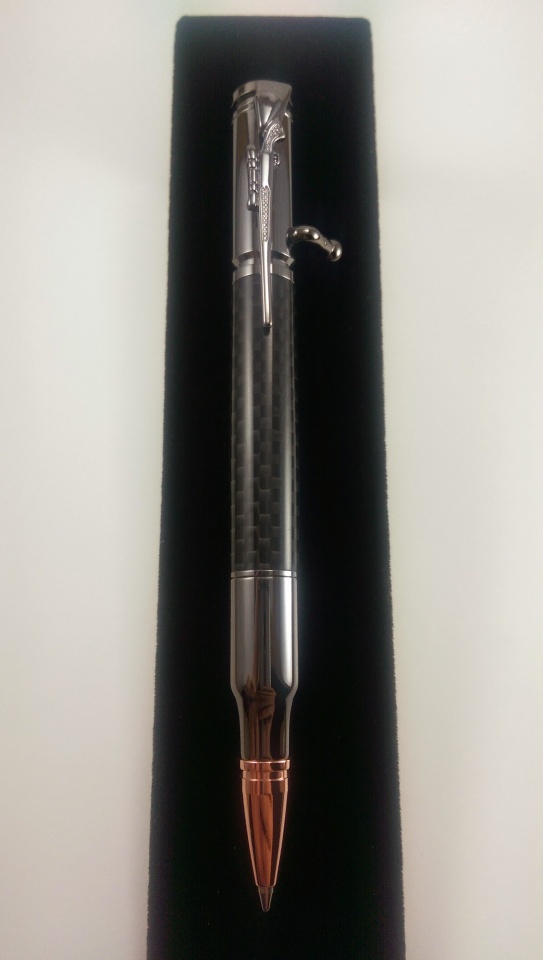 Gun metal bolt with carbon fiber body. I am not a hunter or gun person at all but I think this pen is so... Dare I say? Sexy...