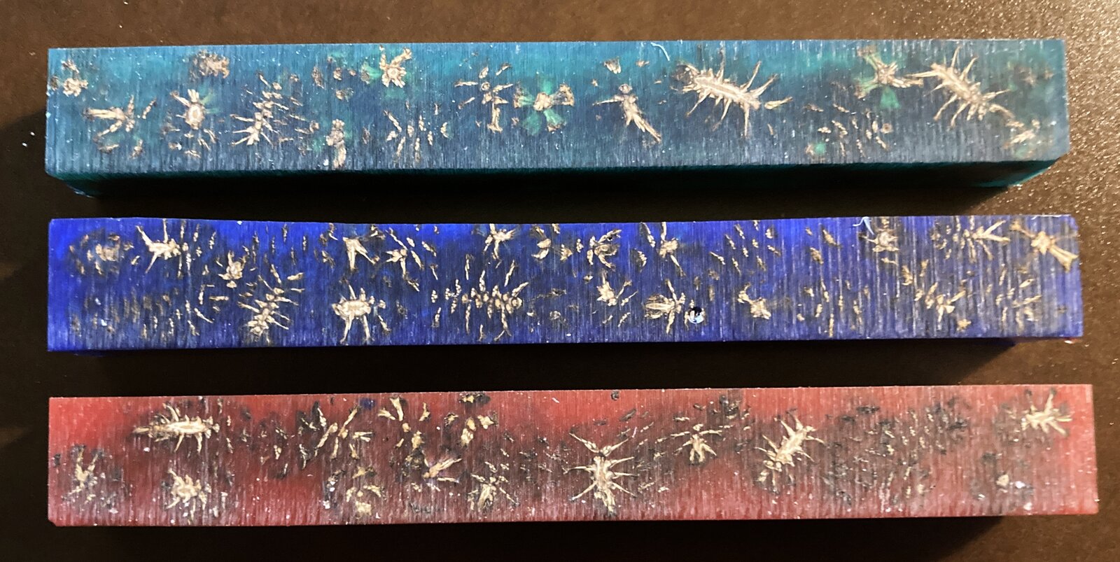 Still playing with casting stuff in resin. I found an Alder tree in the neighborhood, and the leftover blossom looks like a mini pine cone. They were just laying around the base of the tree. They were quite dry, but I stuck them in the oven anyway, just to be safe. I cast 3 individual blanks just to see what they looked like with red, blue and green. So far, I have only made the blue one, but it looks pretty cool. The cones look like some ancient sea critter.