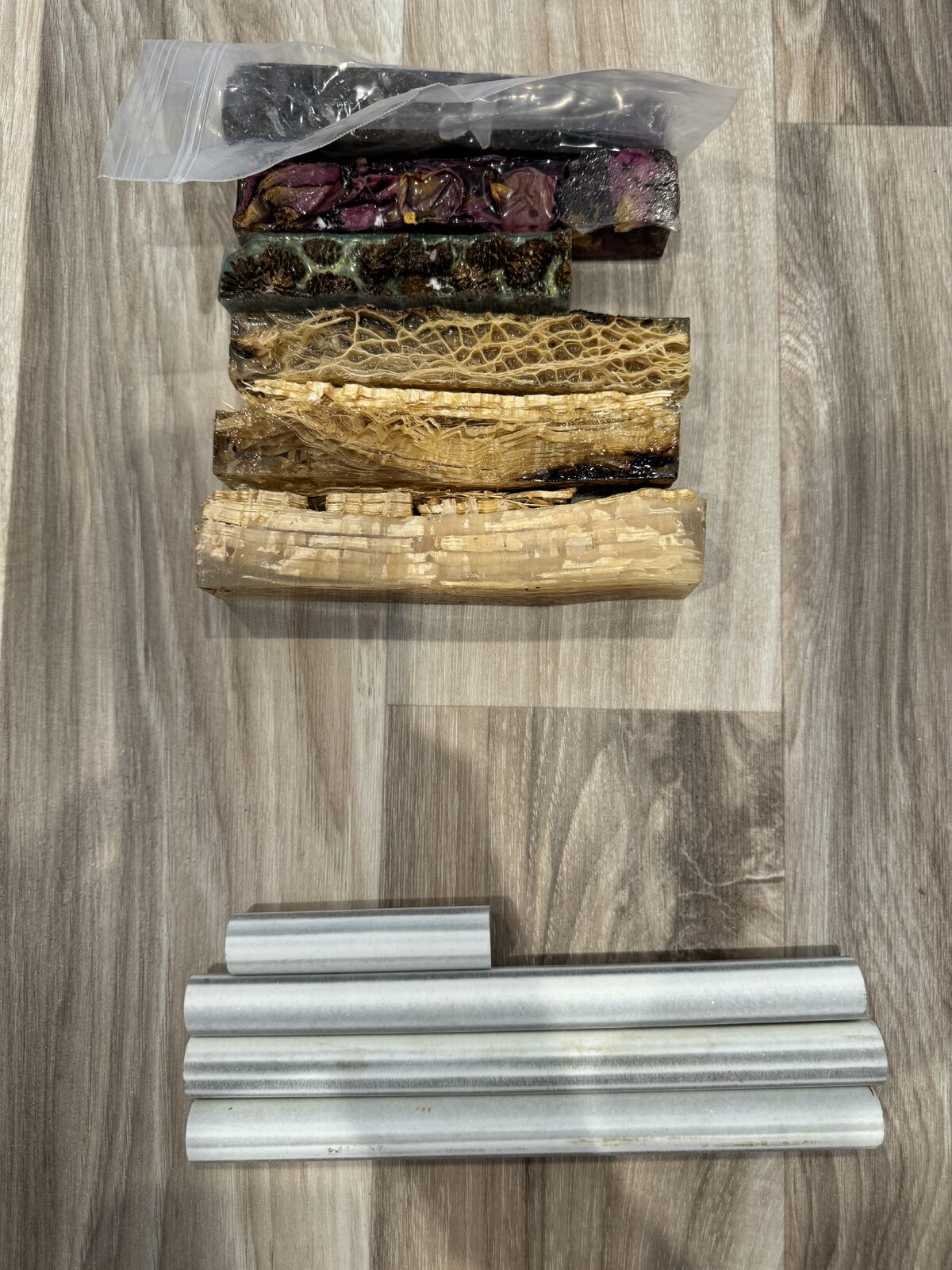 Bottom: Leoglitter rods, this is no longer made, I bought the last of it about 10 years ago when it was discontinued, final picture shows a pen made with it, three rods are 7 3/4" long and short one is 3 1/16" long, so enough to make 7 pens minimum ($40)