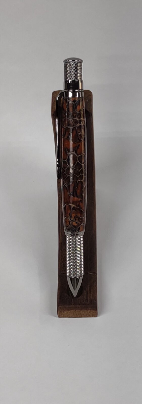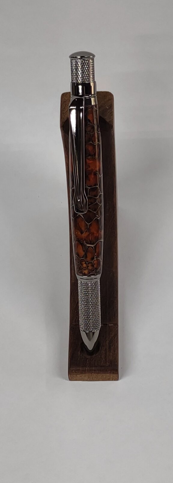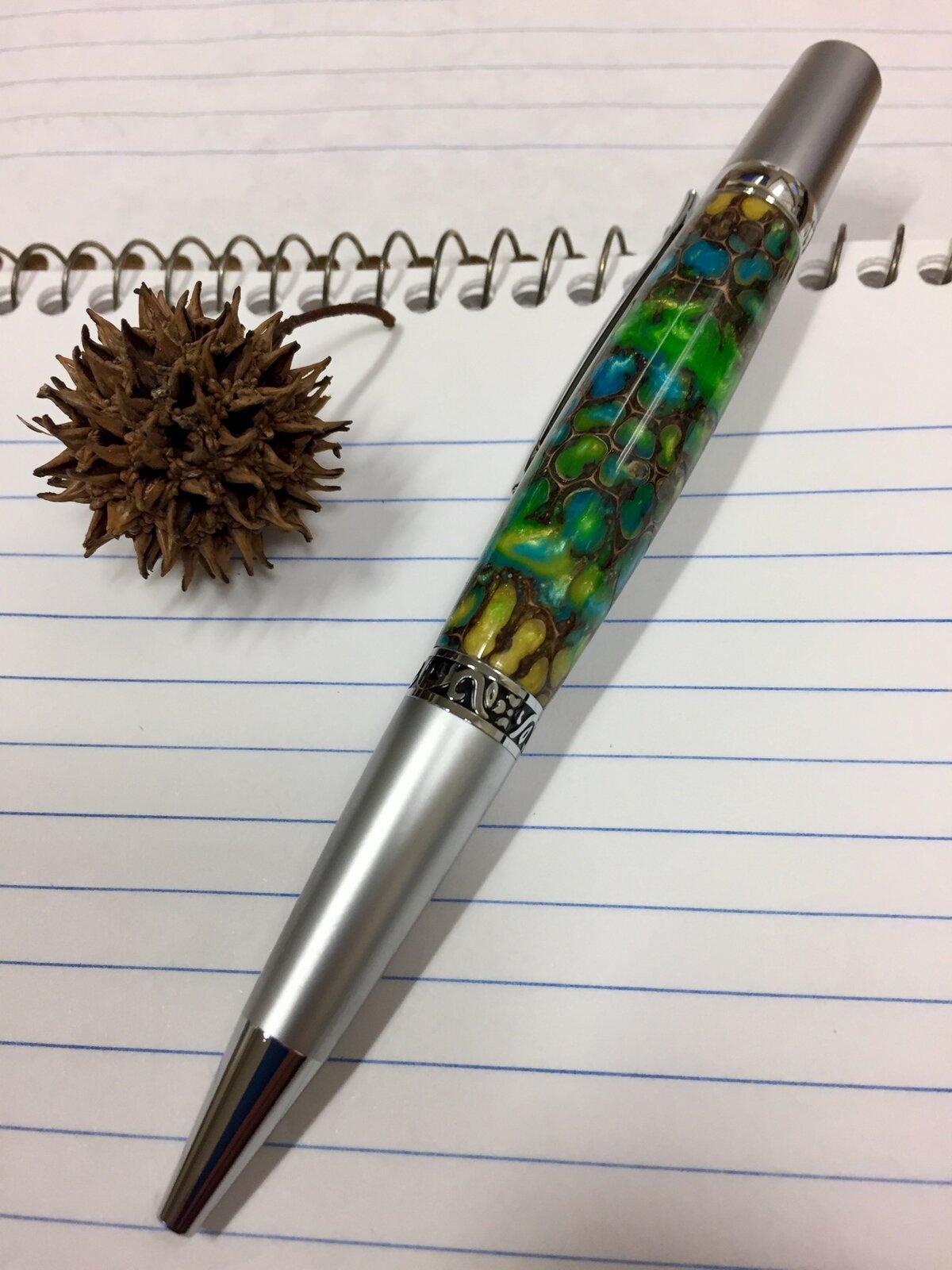Haven't cast anything in awhile. Tried some Sweet Gum balls that I had laying around for almost 2 years. Liquid Diamonds resin with red mica power tint. Pen kit is the Knurl Twist from Bear Tooth Woods. Made an interesting looking pen, maybe a good Halloween pen, but probably not a redo cast.