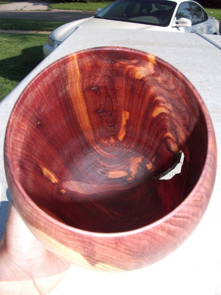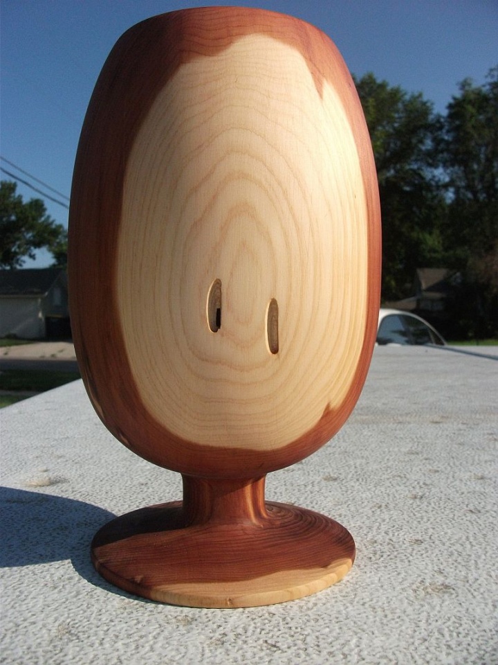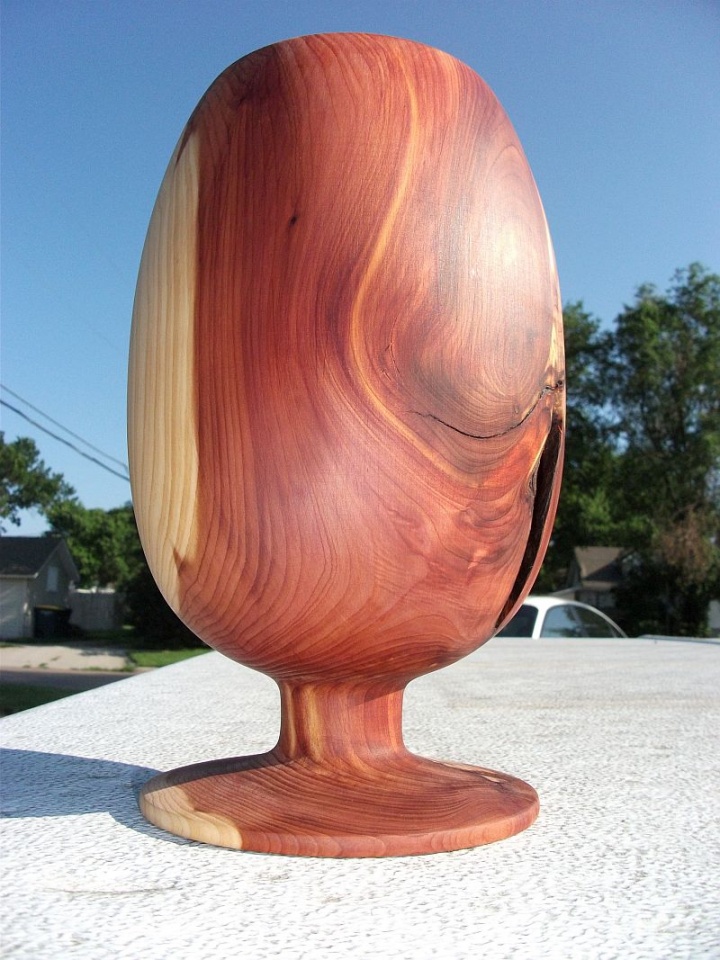 the third and fourth pictures look like a big egg on a pedestal stand... when I get my lathe back up and running, gonna have to try one of those myself... I have a big pile of red cedar out behind the shop just waiting for me to turn.
