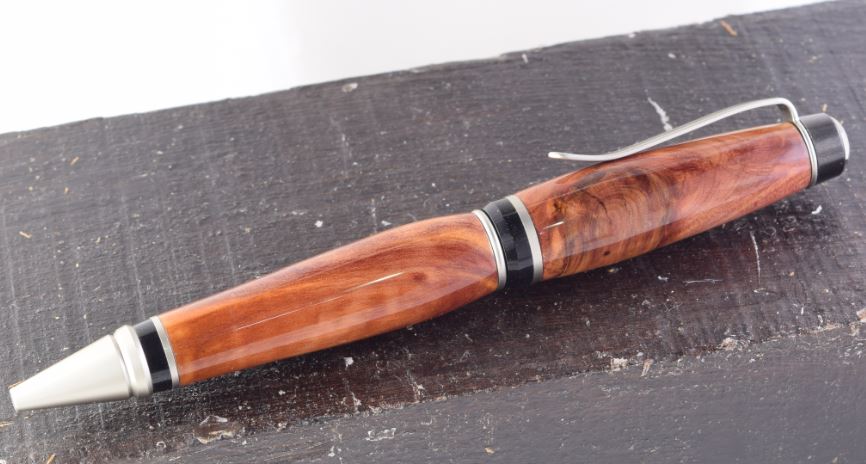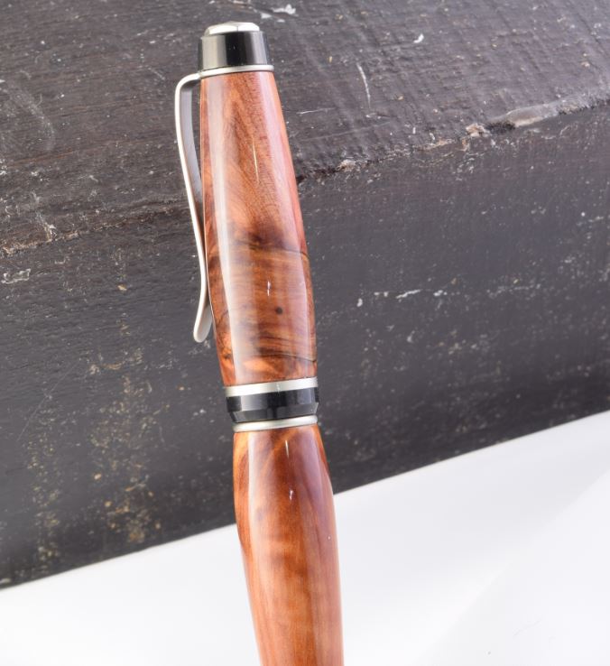 I was gifted some very rough cedar boards, and decided to return the gift with a pen out of the same wood. This was the second piece i cut from it - the first piece had the other corner of the knot, which ejected as it sat in my garage and the temperature dropped. I was using a barrel trimmer on the side closest to the knot, and it cracked the end a little. I filled it in with dust/shavings and couldn't find it afterwards. Finish is CA. I'm very happy with the glossiness of the finish, but on close study after i was done, i found some very small particles on the cap under the CA...not sure if they are dust or voids, but a little disappointed to find that. Most people probably wouldn't see it, but i can't un-see it...I'm sure you guys know how that goes.