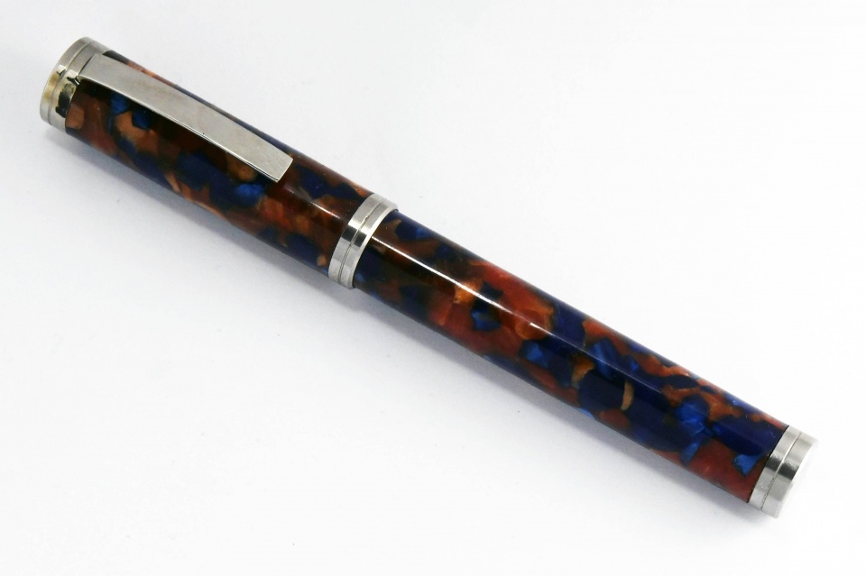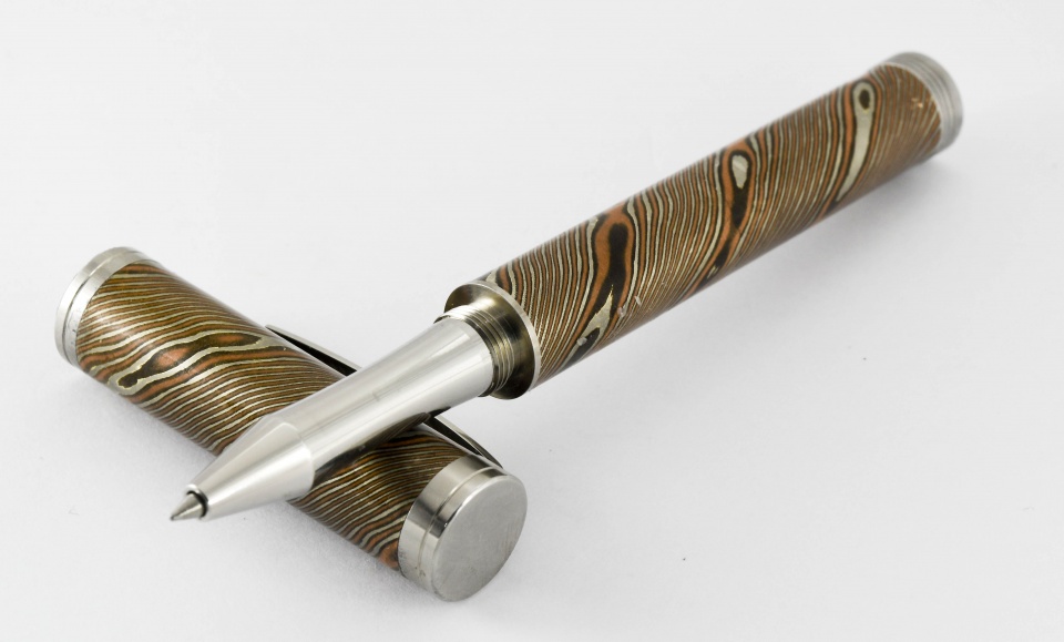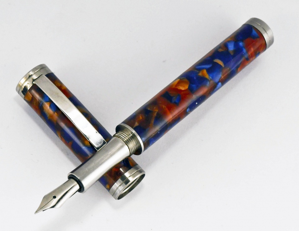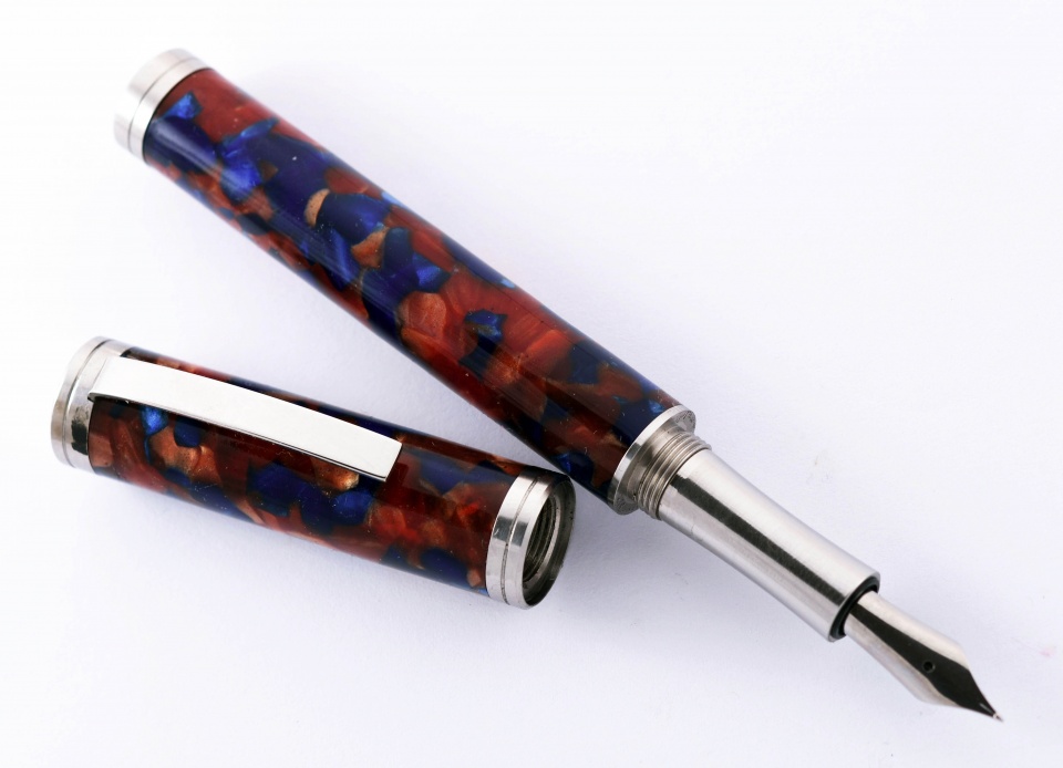 Made this to try out the Shakespeare fountain pen kit. I really like other than taking forever to unscrew threads... Could definitely benefit from triple start threads. Its stainless with a Bock nib. Made with a colorful piece of celluloid. Also made a rollerball version with Mokume. Had fun making it. Doc