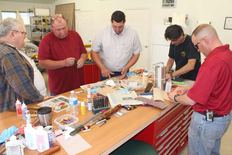 We started our day with some general discussions on basic pen making ideas. Everyone chose an acrylic blank and decided on a color to paint the tubes. After drying, epoxy was tinted to use in gluing the tubes. We also began a segmented blank.