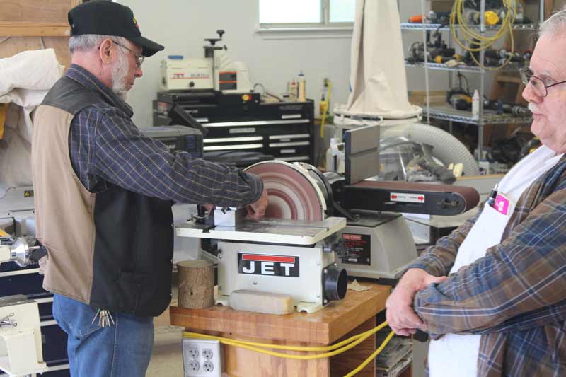 Here are a few pictures of our time together. One is where the segmented blank is worked on. Another shows Oldsarge trimming his acrylic blank on the sander. Another shows Whitehat 1994 trimming his blank with the pen mill.