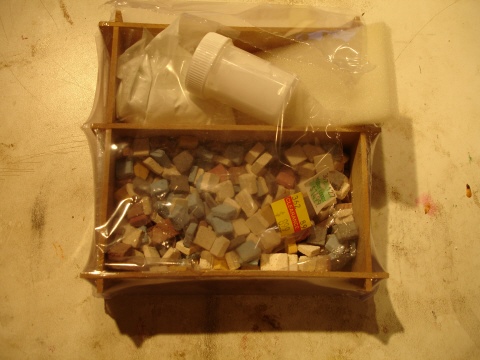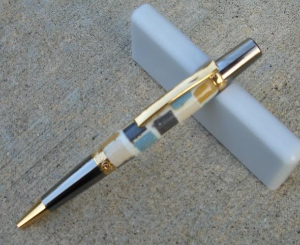 I bought this little kit at Hobby Lobby on sale. I have big visions, but wouldn't dare go too crazy without giving the product a test run first. I'm not that crazy about it and it was a brute to turn. It was a constant effort replacing and filling grout holes too. I don't actually know that it is ceramic, but it certainly is some sort of cement product with actual grout. I sanded most of the pen down by hand on my belt sander, then finished rounding it real careful and gentle with just the corner of one of Ken's carbide tools. It has a CA finish over it. I'm not crazy about it and it was way too much effort for the results.