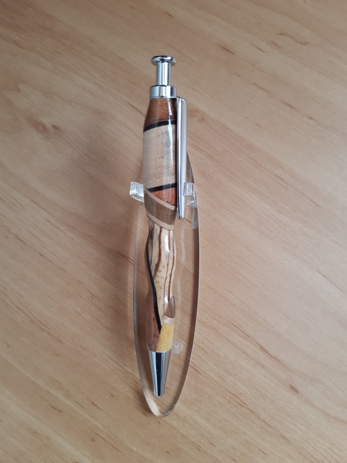 I was just playing today and made a chaos pen. I took cutoff scrapps from making a cutting board and randomly glued them up. Sliced it into 1" wide strips on a 45, flipped every other piece and re-glued. Sliced again in a 45 and re-glued to make a big chaos blank. Today I cut my first pen blank out of it and turned it. Interesting effect! I will be able to get quite a few more pens out of this mess and each one will be unique. Not bad for scraps that I otherwise would have tossed! Woods are maple, cherry, walnut, and purpleheart.