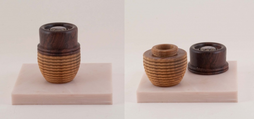 Box with chased threads. Lid is Burmese Blackwood with a Paua Shell inlay. Body is Lignum Vitae.Around 3" (7 cm) tall. Not happy with the design, but this is my first successful piece with chased threads. It was a fun experiment, I have to experiment some more to make the threaded elements less of an interference.