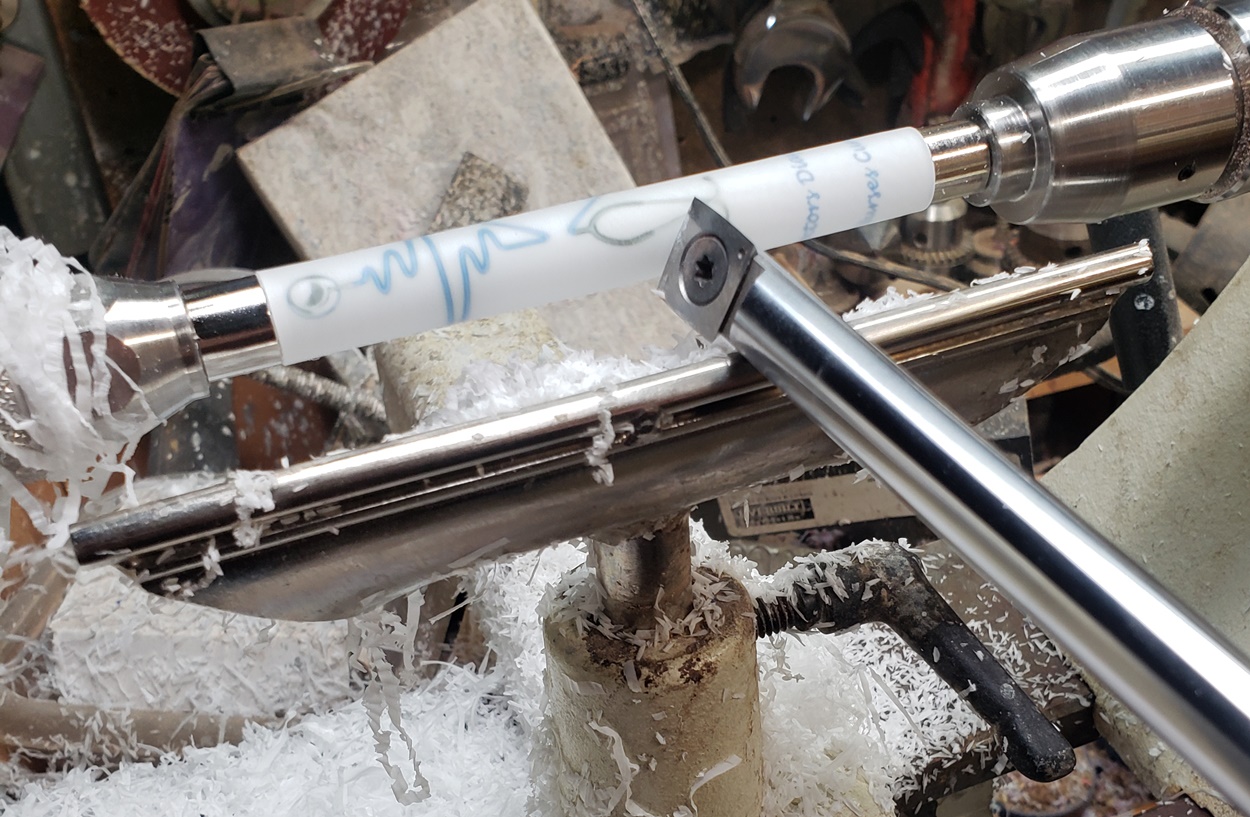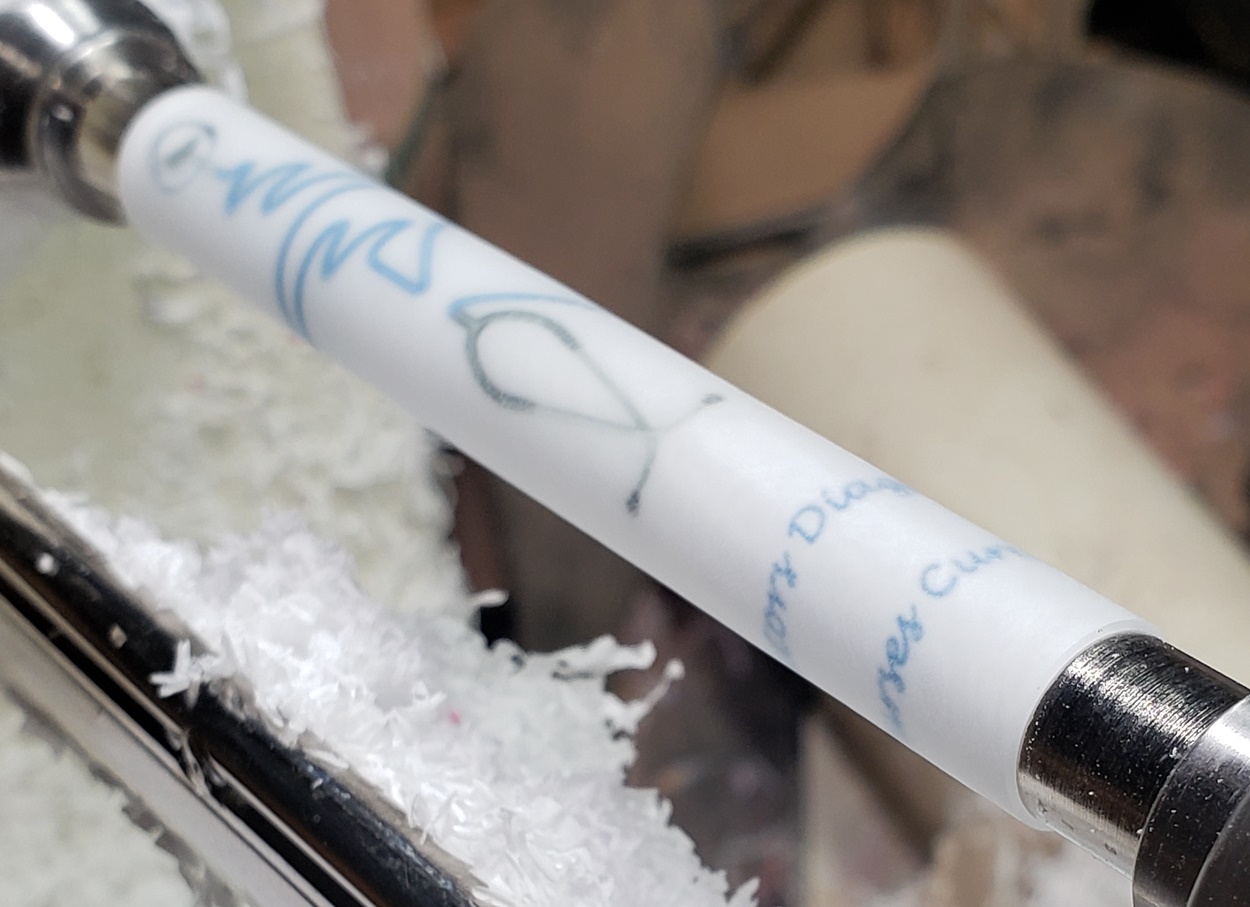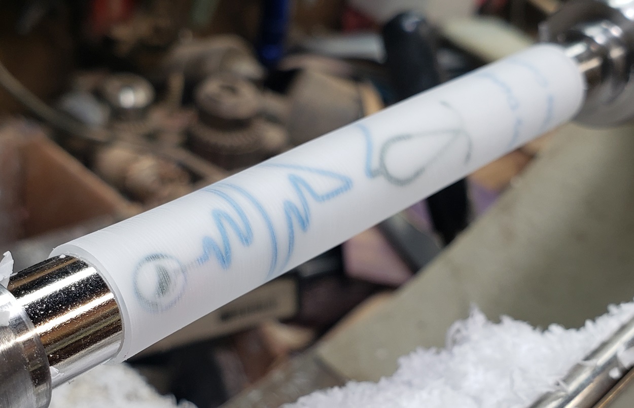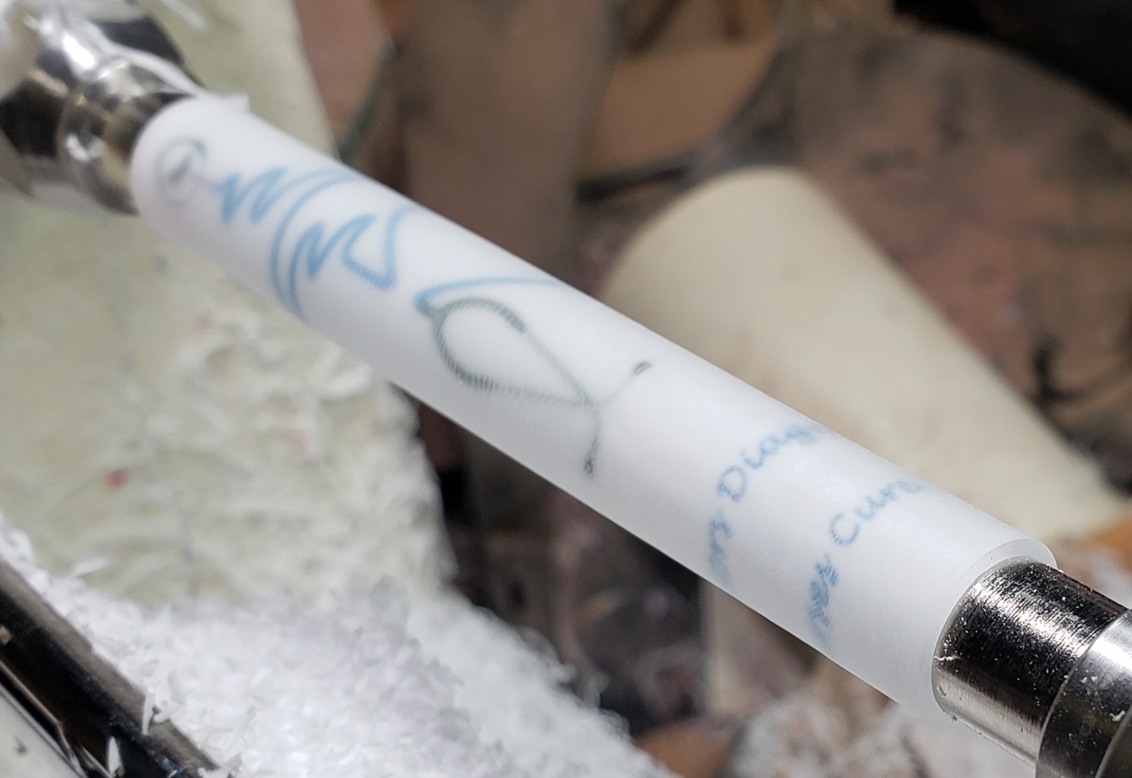 Any idea what is causing the chatter? It's only on the right (tailstock) side. It quiets and gets smoother towards the left (headstock) side. It's a fresh edge on my carbide chisel. The blank is a label cast from Wooden Quill. I don't know what kind of resin it is. Each side looks the same, but you can feel that the left side is smoother than the right side. It's on an Ultra-Shear mandrel system, turning at about 2,000 rpm. I'm perplexed.