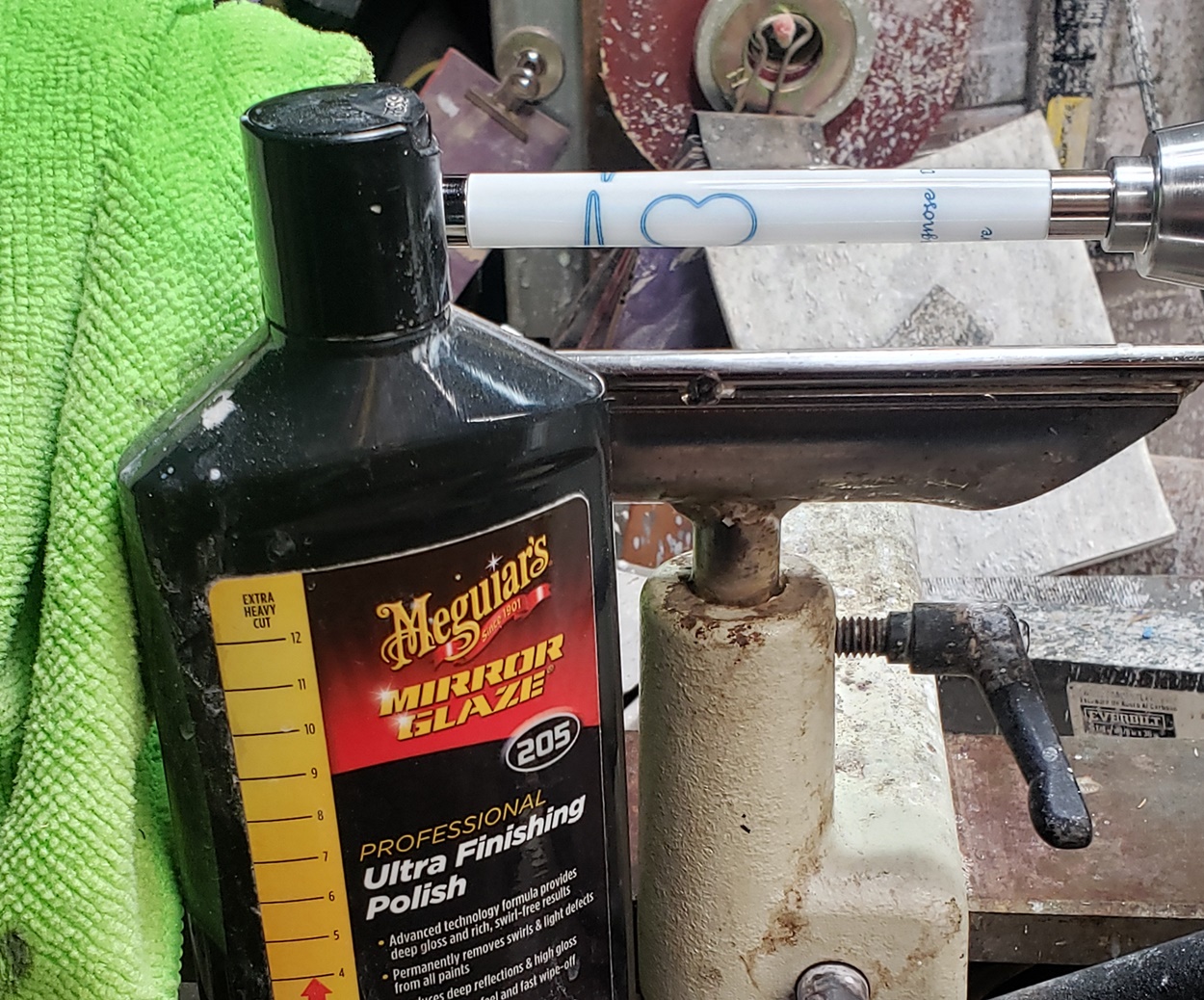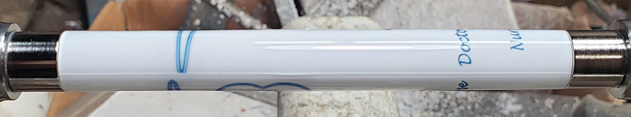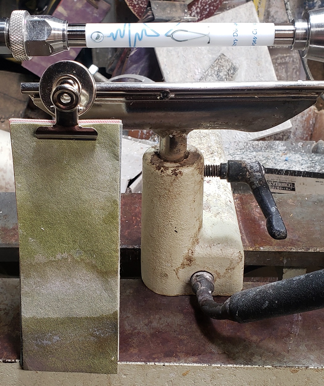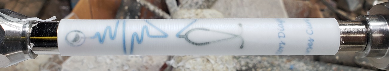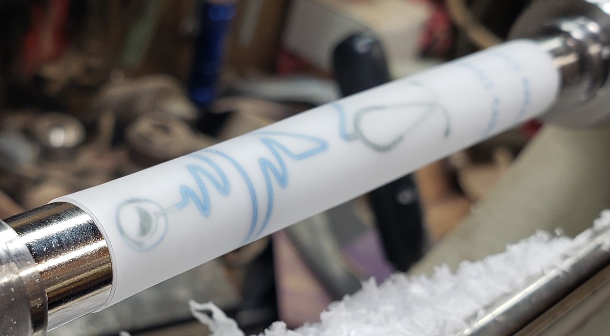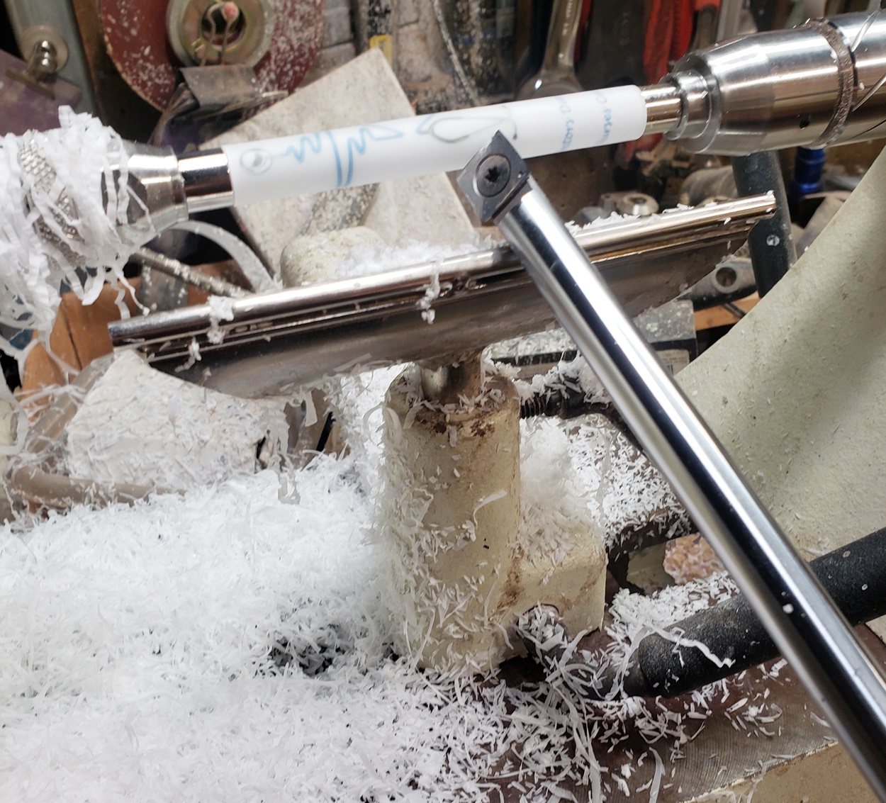 Any idea what is causing the chatter? It's only on the right (tailstock) side. It quiets and gets smoother towards the left (headstock) side. It's a fresh edge on my carbide chisel. The blank is a label cast from Wooden Quill. I don't know what kind of resin it is. Each side looks the same, but you can feel that the left side is smoother than the right side. It's on an Ultra-Shear mandrel system, turning at about 2,000 rpm. I'm perplexed.