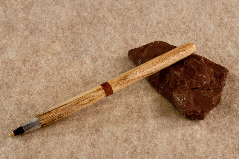 Been playing around with this mainly as a way to advance my skills without wasting good blanks and pen kits. The is a Paper Mate (10 for a buck at Wally World). The wood is Spalted Hackberry, of which I have about 50 blanks, The "center band" is from scraps. The pen is refillable.