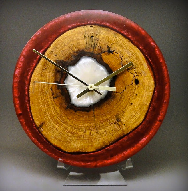 I've sent Mark a couple of boxes of pecan and other wood and he made this gorgeous clock for me. I asked if he could use University of Houston colors (red & white) - all I can say is WOW!. This slice of spalted, lightning-blown-out pecan is from our farm in Columbus, TX.