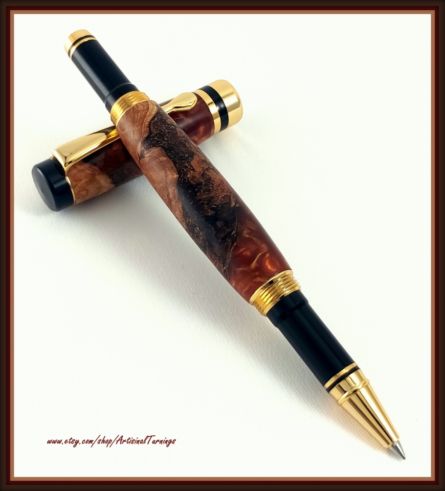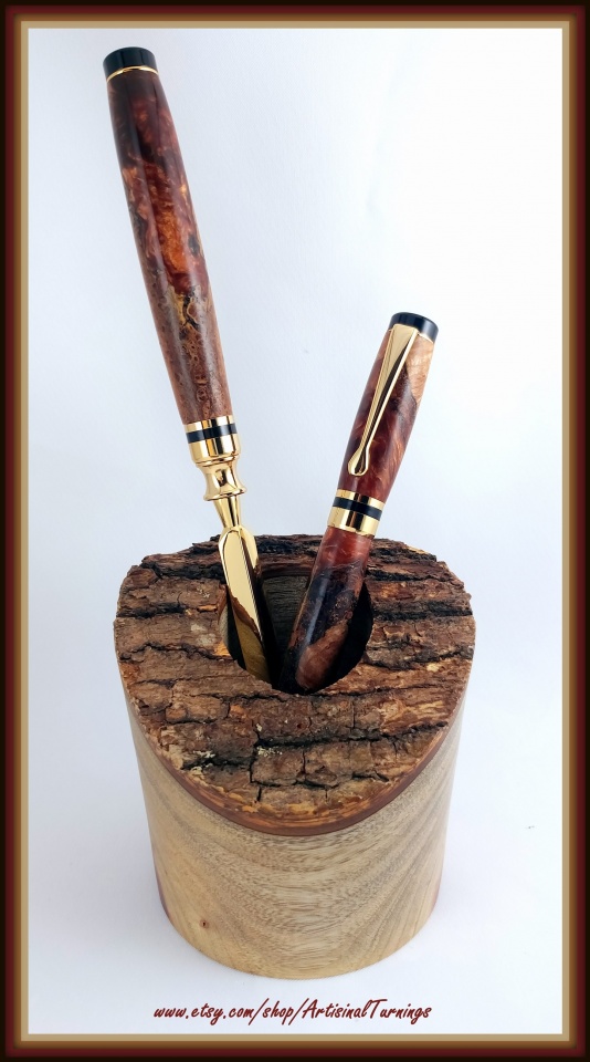 I cast the hybrid cherry burl blanks for the pen and letter opener. The pen stand/cup was turned from camphor. Thanks for looking!