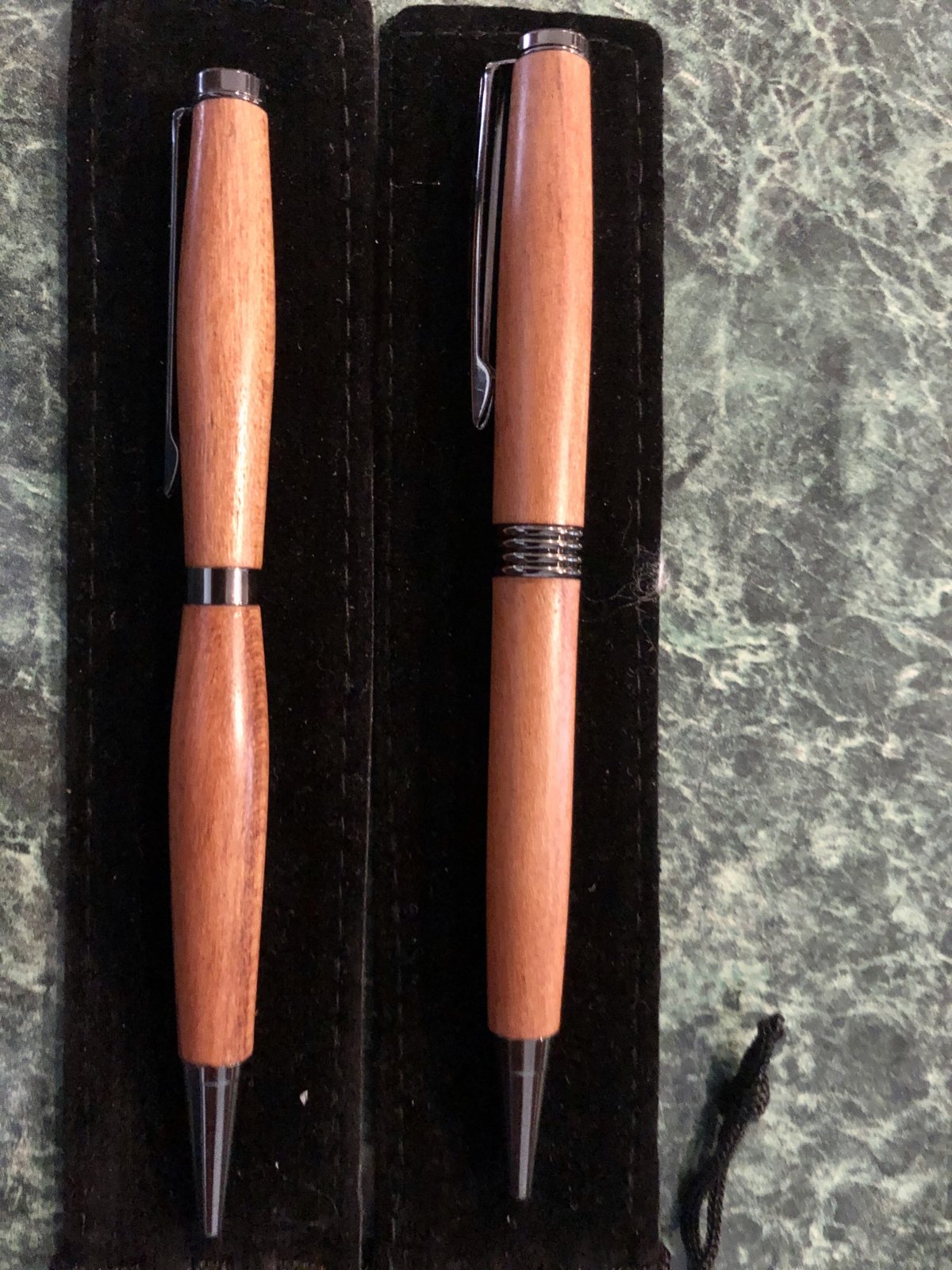 I turned these two pens out of a piece of scrap cherry wood castoff. Made these for a couple of friends of mine who have been there for me ... hope you like them ... the finish is CA / Gun Metal.
