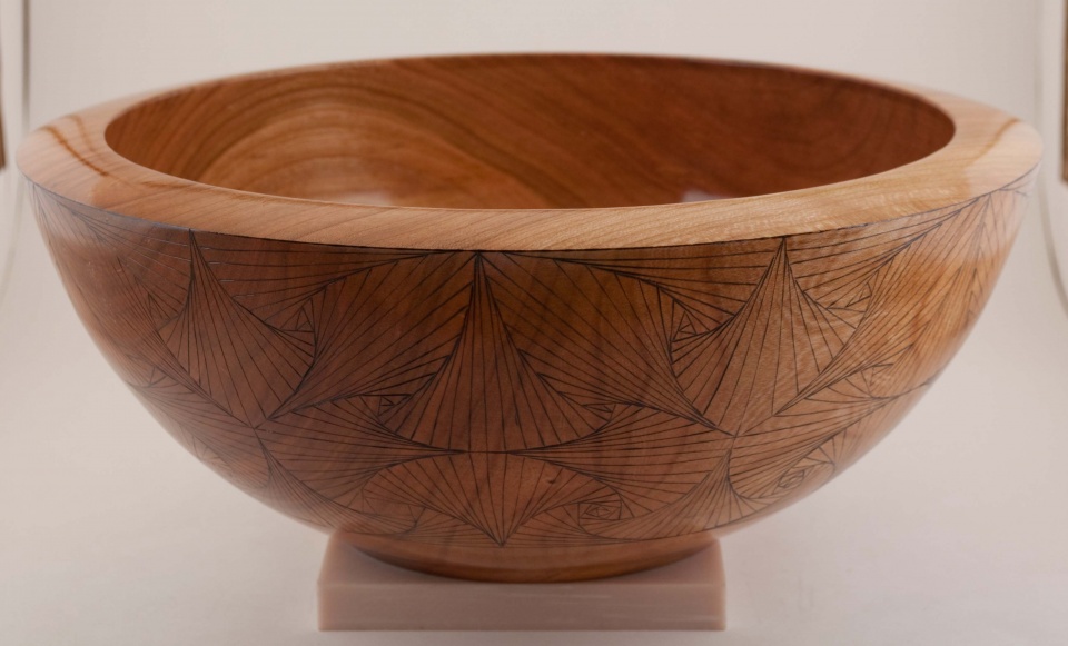 Cherry Bowl with Zentangle Inspired Pyrography. Created as part of a public demo at The Woodworking Shows to promote the artistic side of Woodturning and the local woodturning clubs of Connecticut and Massachusetts. Around 10" (26 cm) across. Finished with oil and polyurethane.