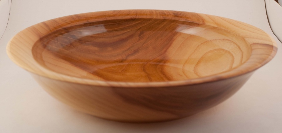 Chinese Elm Bowl. Around 9" (22cm) across, finished with Bush Oil and Polyurethane. Rough turned in Santa Ynez while on vacation and final turned back home once dry.