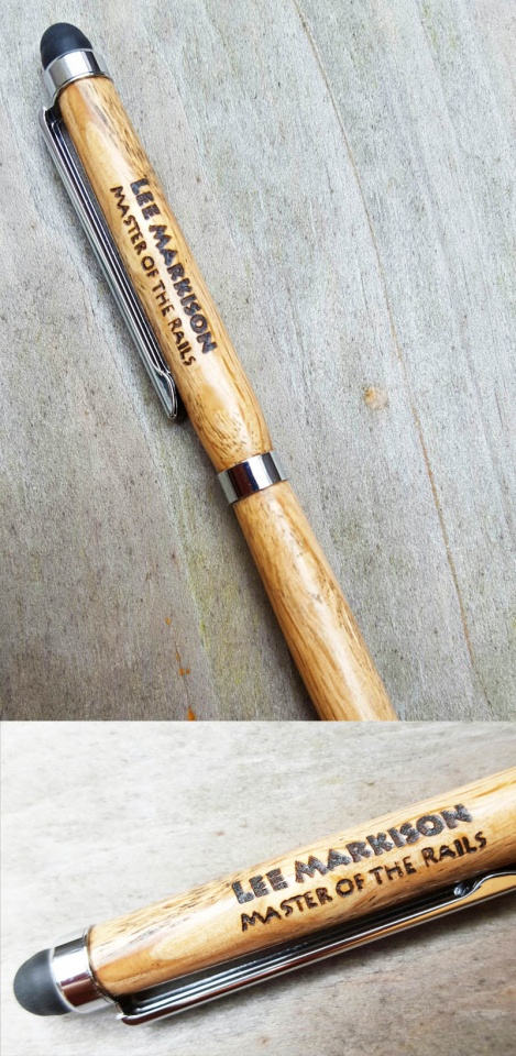 My oldest daughter Lee has been programming in Ruby on Rails (application framework software language), so I've made her a quick little slimline to recognize her work (30 min. from tiger oak blank to completion - including engraving - see Michael's inspiring thread here: