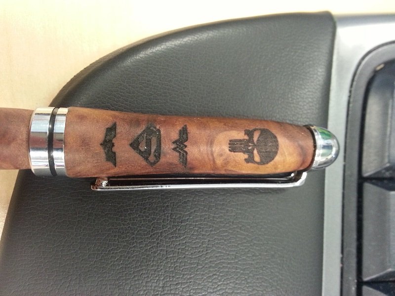 Here are some photos of some of the engraving I did on a Euro style twist pen. The pen is over a year old and was originally finished with friction polish. Sorry for the fuzzy pictures, I just took them at my desk at work. From L to R: Dr Who, Superheroes, Military, more Military, over all view.