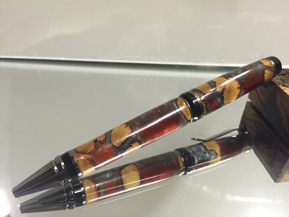 Had our son baptized this weekend and made these two pens for the Godparents. One is a garnet/silver Alumilite resin with cholla cactus pieces embedded. I sanded through 12,000 grit with Micro Mesh and then put on a 5 coat thin CA finish on top. Then resanded back through to 12,000 grit and hit it with Meguiar's PlastX polishing compound. Used a black titanium cigar pen kit.