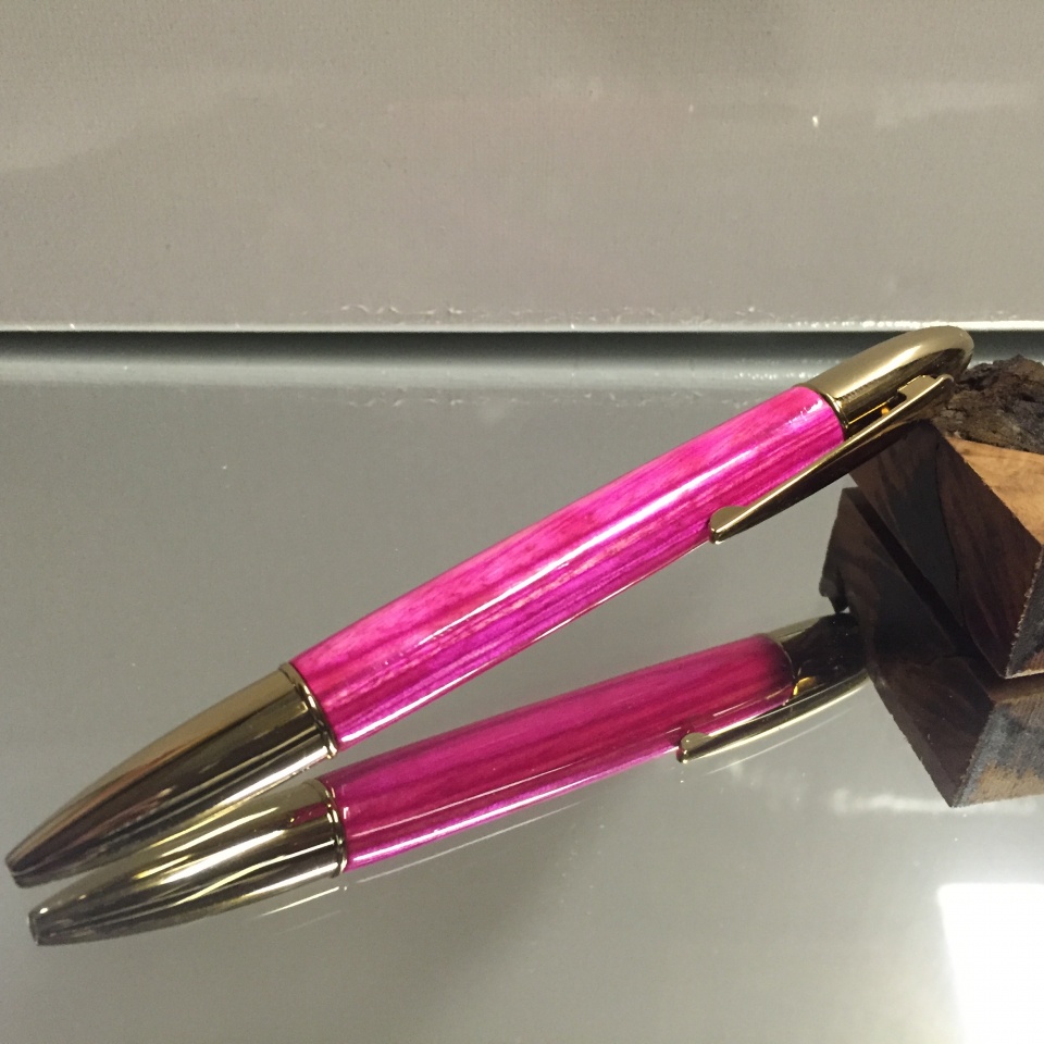 The other is a pink Spectraply blank that I picked up in Cousineau's 20 blanks for $10 blowout sale. First time using Spectraply and I was very impressed with how it turned out. 8 coat thin CA finished using the above sanding/polishing method. Used a PSI Falcon pen kit