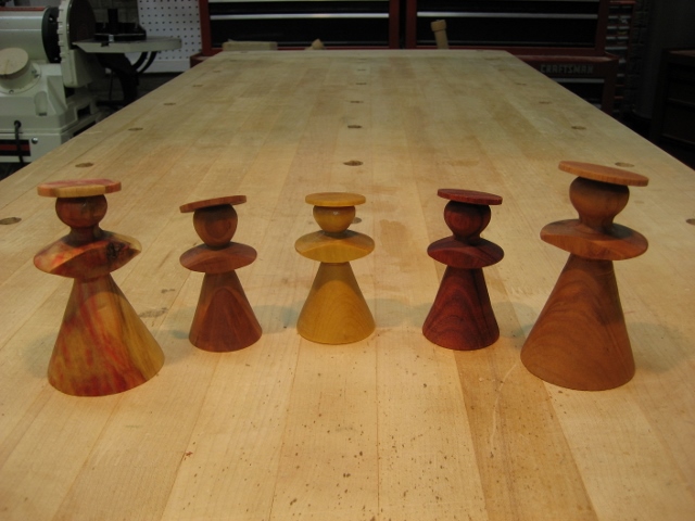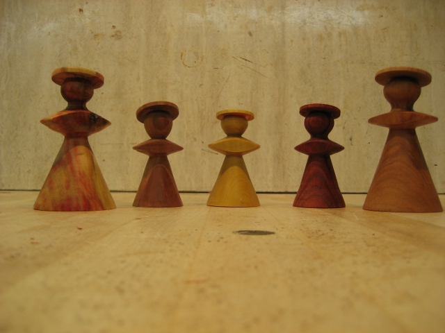 Wood species from left to right: Flaming Box Elder, Cherry, Yellow Heart, Padauk, Cherry. Haven't been very adept at using my skews, but the angel turnings gave me some needed practice with my skew.