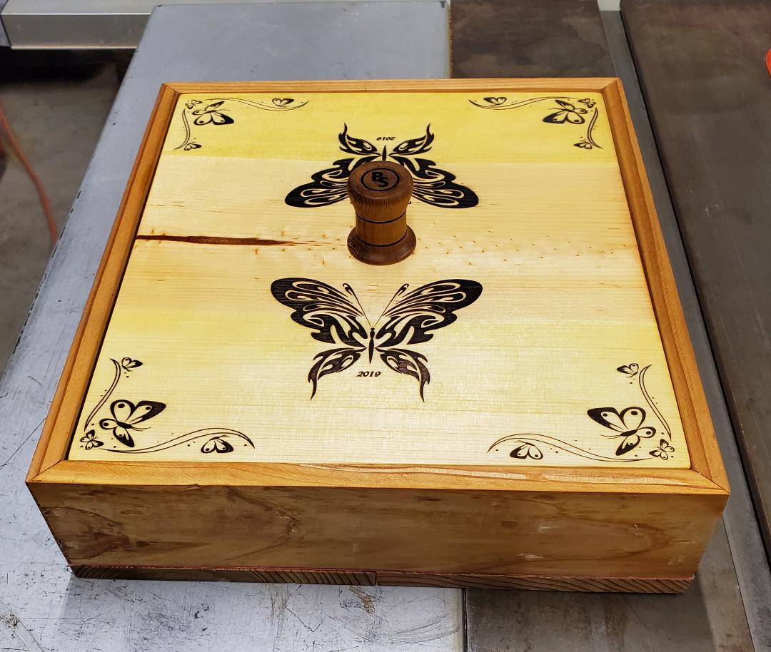 So I know I posted these a while back but here are my finished gifts for my Mom and Sister. There aren't many options in this oilfield country to buy hardwoods. Oak is about all you can buy and I didn't want to ship boxes weighing in at around 30lbs. Lol So I used some cutoffs of my cedar patio I built last year. Put them thru the planer and used those. The lids are different also. Only had one piece of pine to do my sisters lid and had an old oak sinktop that I planed down to size also. Covered the bottoms with felt. Then I decorated the lids with my Neje 3500. If I know them, they won't ever use them and will be happy with them no matter how odd they look. Lol Btw, My sisters favorite color is Pink and my Mom's is blue.
