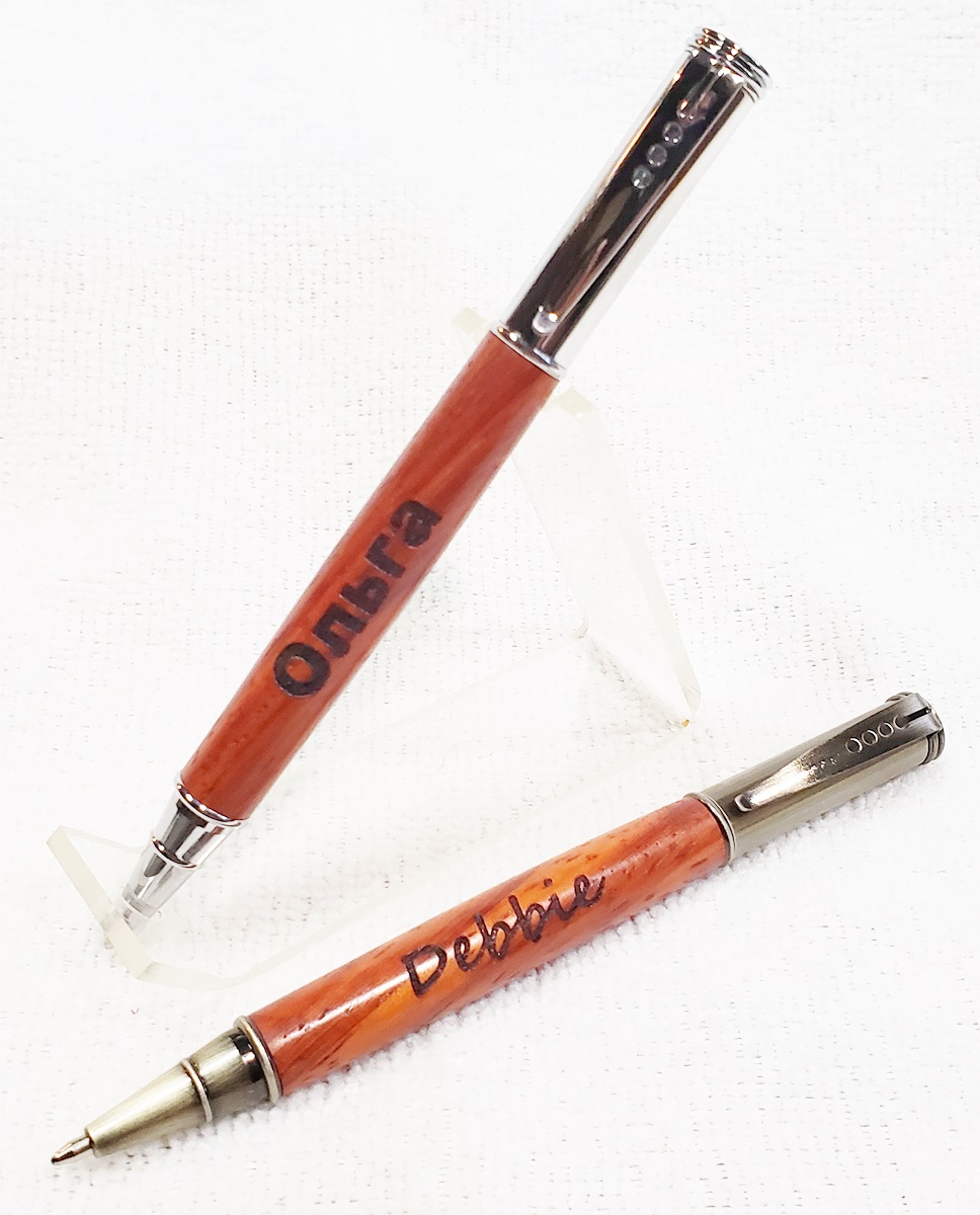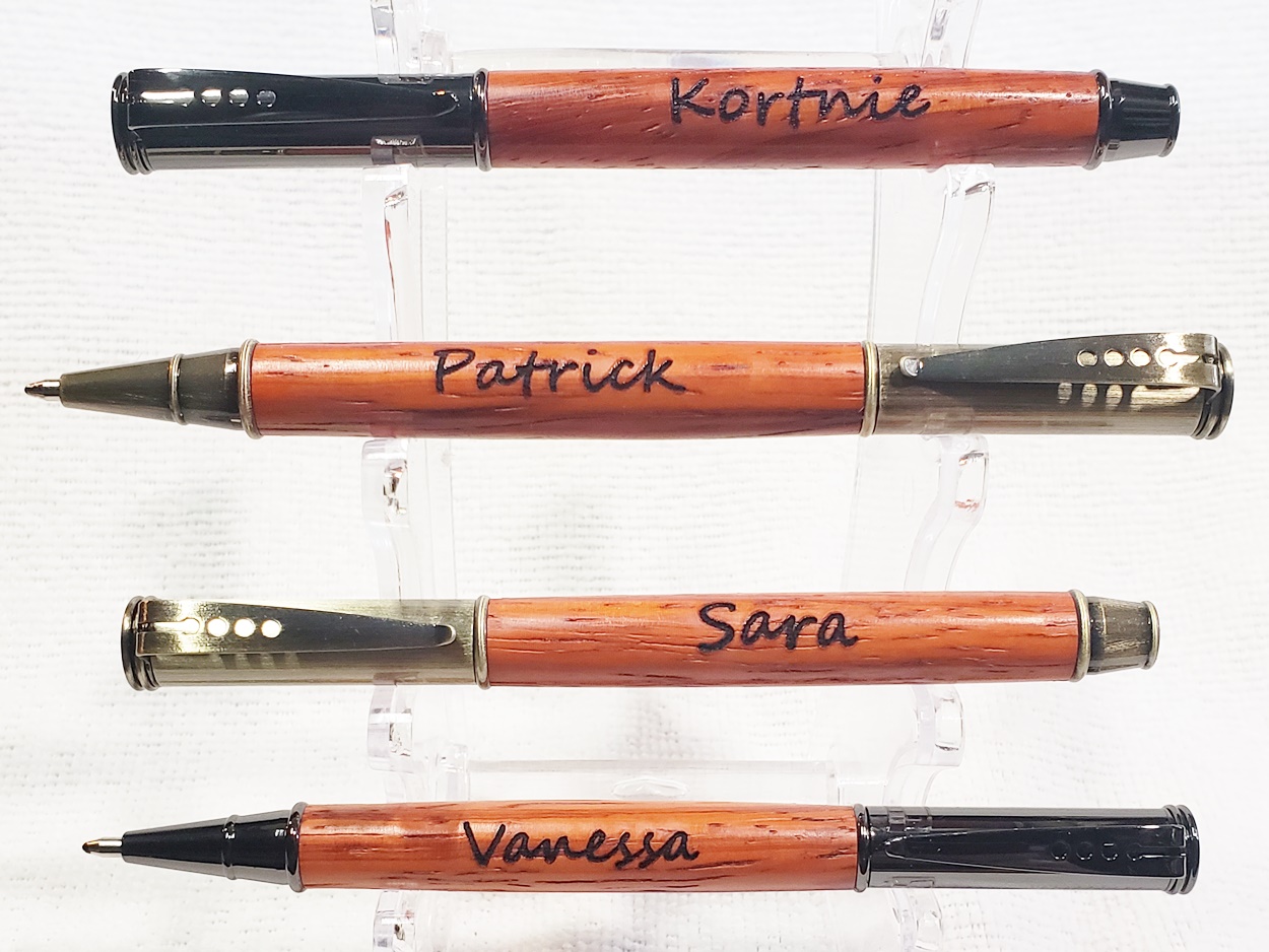 These are Editor pens for some of my co-workers. Some are gunmetal, and some are antique brass. The wood is padauk, finished with Pens Plus. Very happy with them.