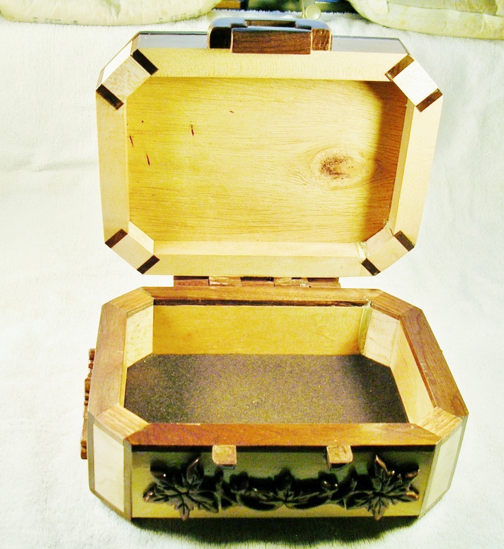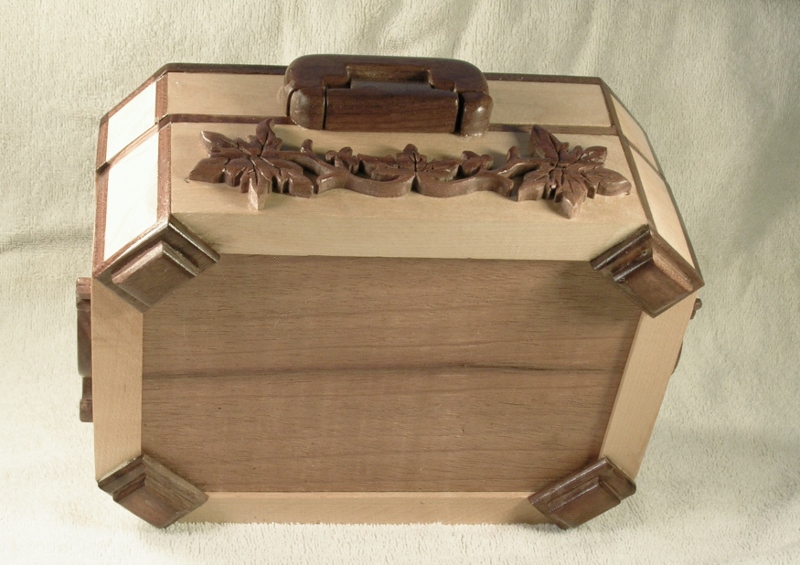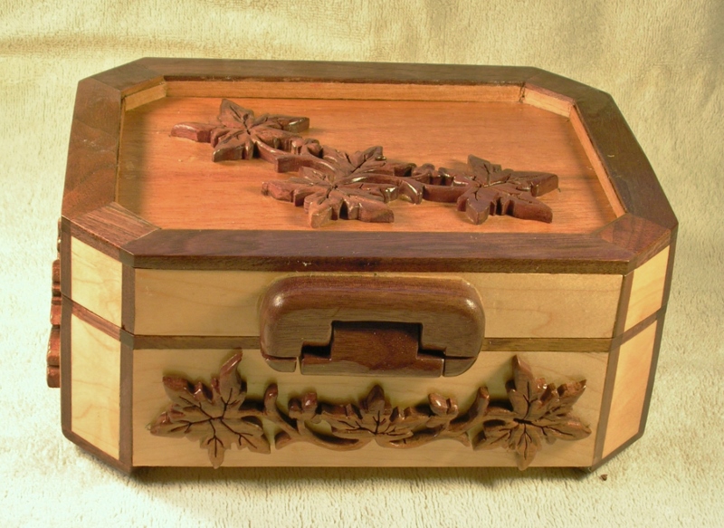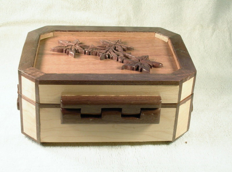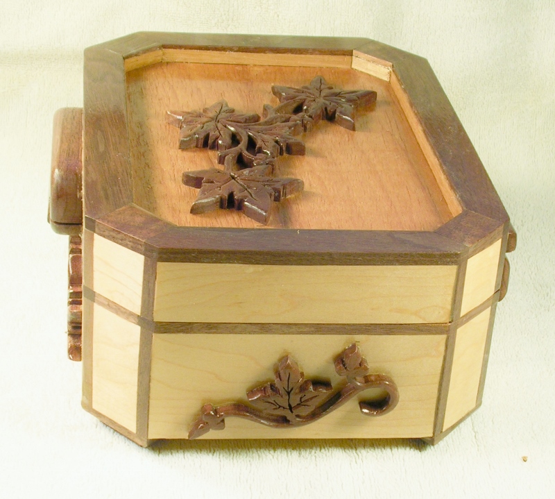 One of the items I received for Christmas was a three piece set of Bird's Mouth carbide cutters, also know as glue joint cutters. They allow you to cut a 6-8-12-or 16 sided container perfectly every time once properly set up.( about a 1/2 hour plus several trial cuts and fittings ). I couldn't wait to try these cutters out !! The case I have made here is 8-sided using Walnut, Maple and mahogany segmented sections. The case is truly all wood including hinges and clasp, and the Bird's Mouth joints can be clearly seen in the case open photo. Appliques are scroll sawed designs by Pat Spielman, hand carved, and sanded to give dimension. Small Walnut feet added, finished with clear lacquer, and a felt bottom liner added. I modified the cutting order of the boards by cutting two joints, one on each of four of the boards, and none on the other four. this allowed me to segment the Walnut onto the ends of the four uncut boards without having to worry about the angles. Again, the case could be fitted with any number of different configurations for the interior, and made into different sizes and shapes by changing the length of the boards as the angles will always stay the same. Sorry for poor quality photos, haven't used photo setup in a while !! Jim S