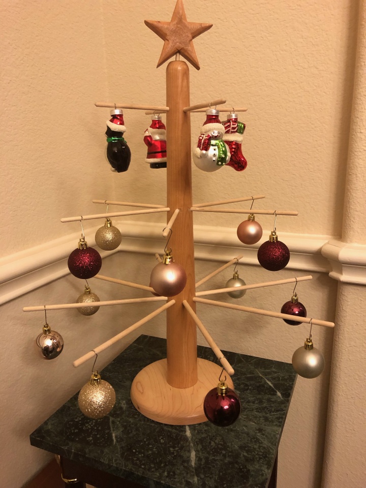 A simple Christmas tree shaped display for displaying up to 18 Christmas ornaments. It is about 18 inches tall and 18 inches wide at its widest point. It is made with cherry and birch.