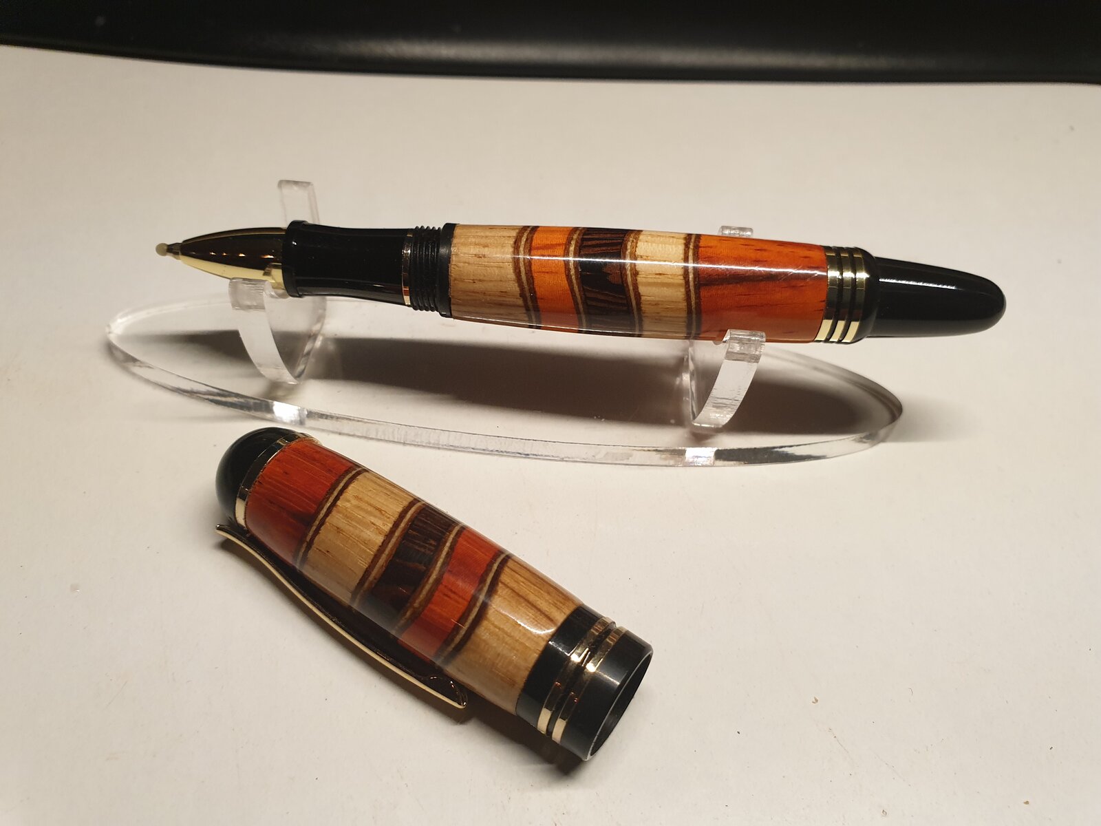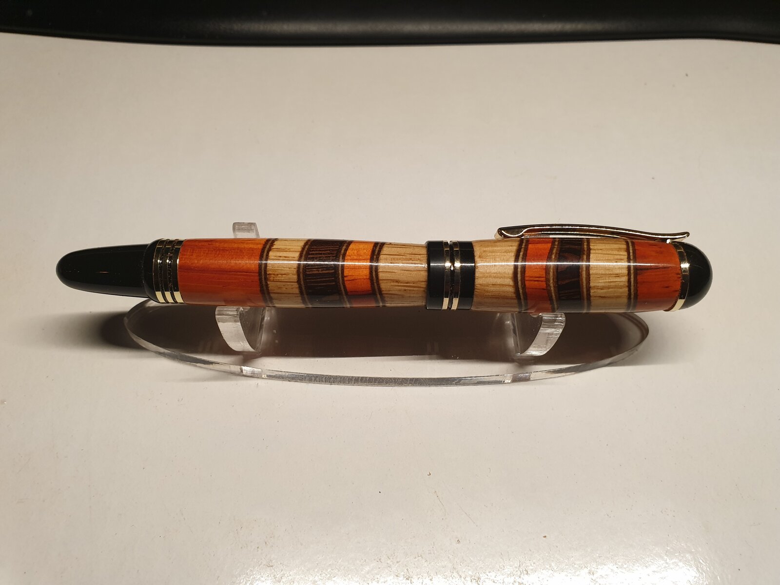 A churchill pen kit, but what to make of it? Segmented ofcourse, that is my middle name, so i looked around in the shop for wood pieces, some oak, padouk, cherry, wenge, beech, yew, hmmm. Then my eyes fell on the red hole saws, 22 mm, 29, 35, 45, 65. Made a oak dowel 22 mm in diameter, the took a padouk blank and cut the same half round on each end. took the 29 mm and took some pieces of the padouk, about 8 mm or so, then wenge, 29 mm rounded and 35 mm saw took 8 mm off, the 45 mm saw in the drill chuck and the oak blank again, padouk for the endpieces.