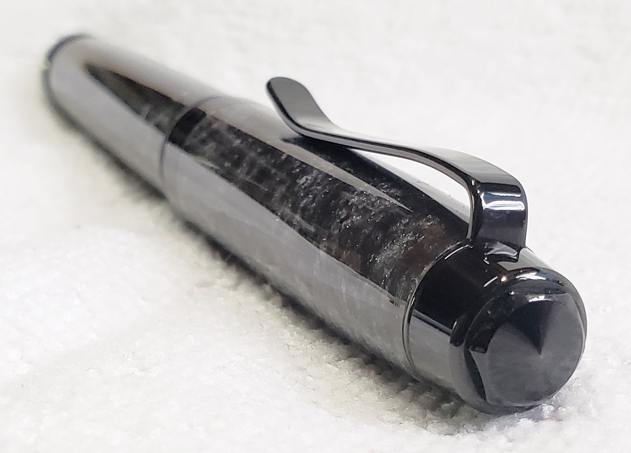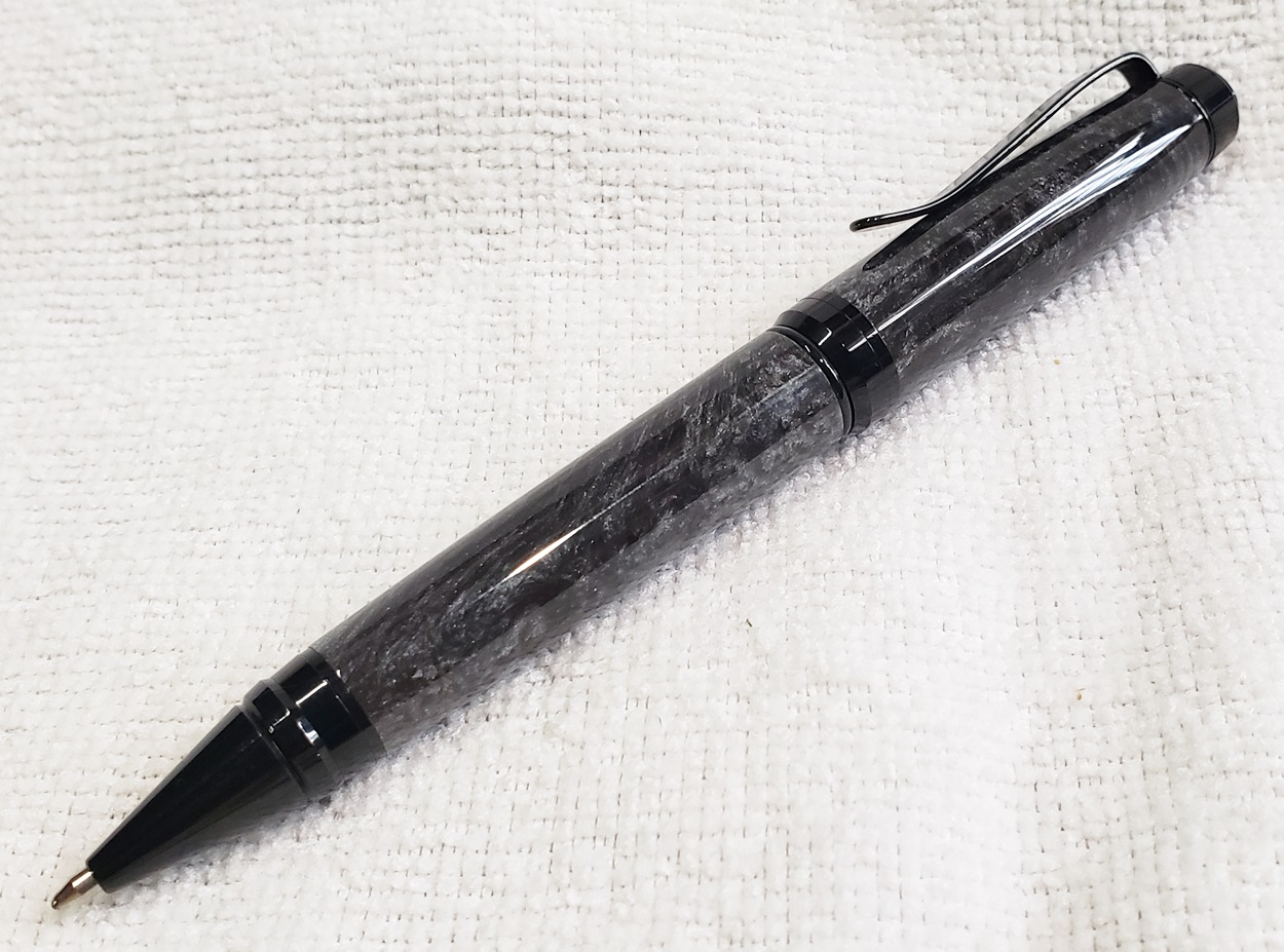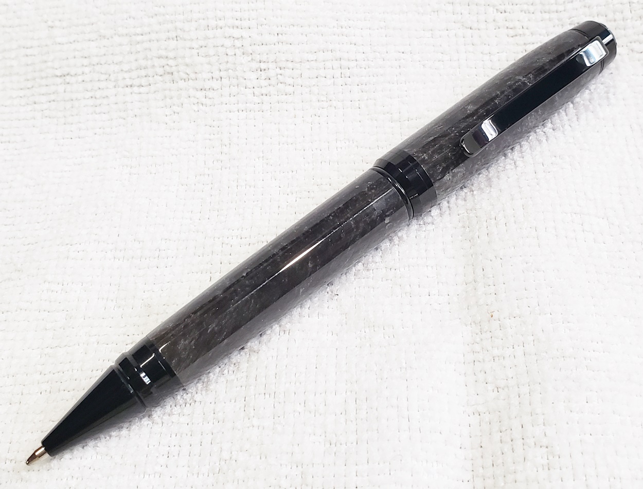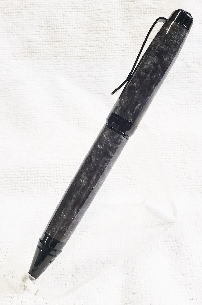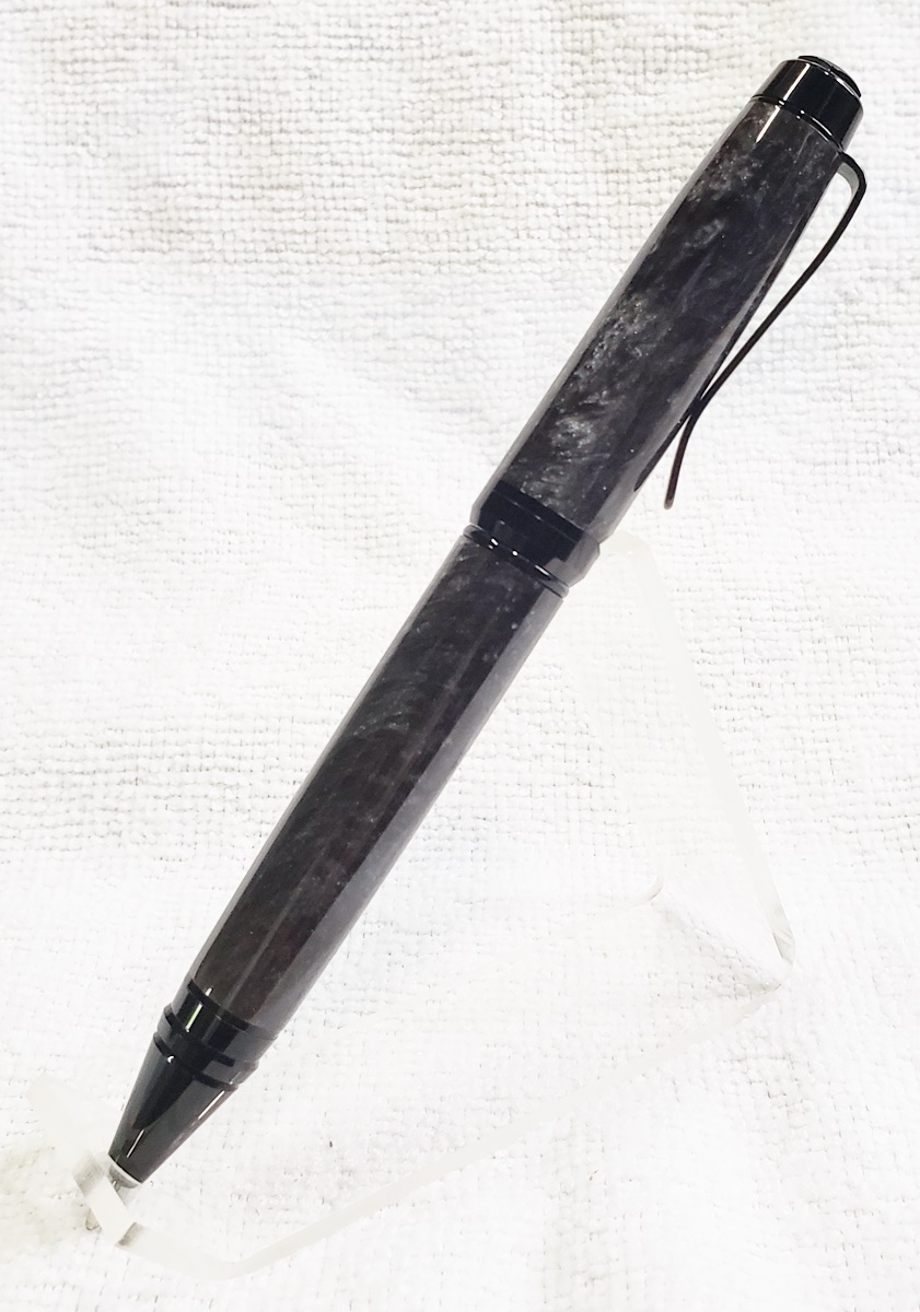 This is a cigar pen in bright black, from Woodcraft. The blank is a Rhino called Antique Silver. It's subtle, but I like it, especially with the black pen components. Very happy with it overall.