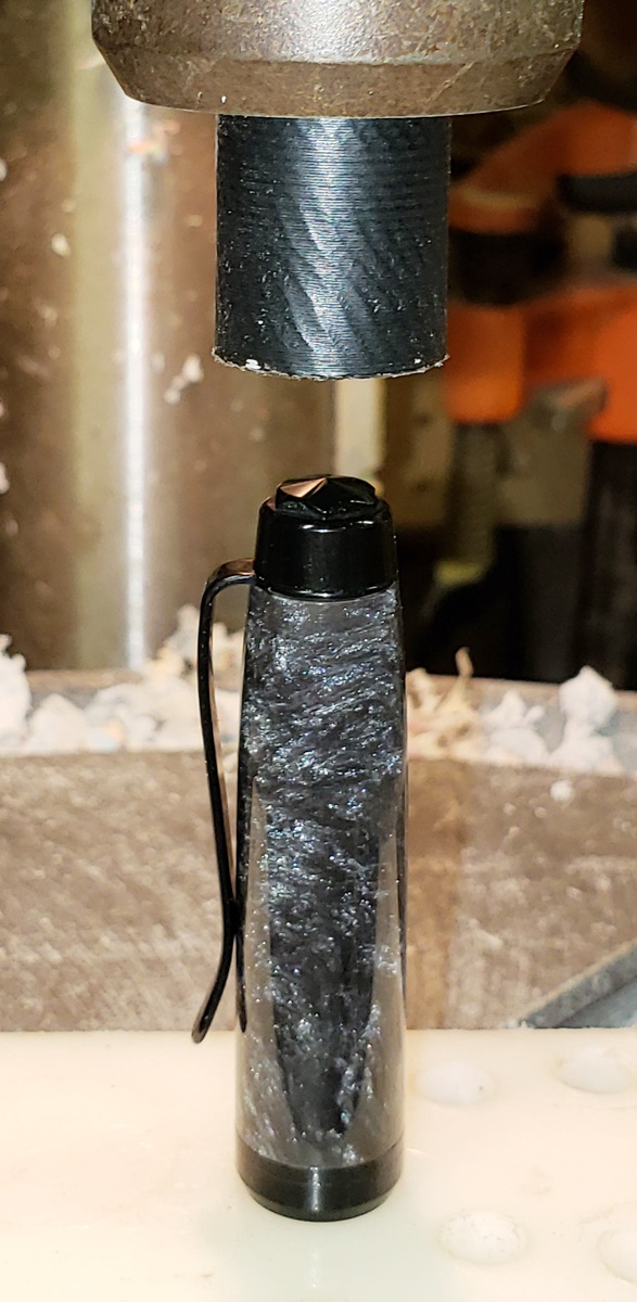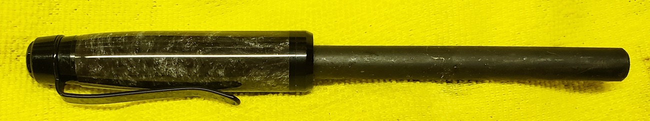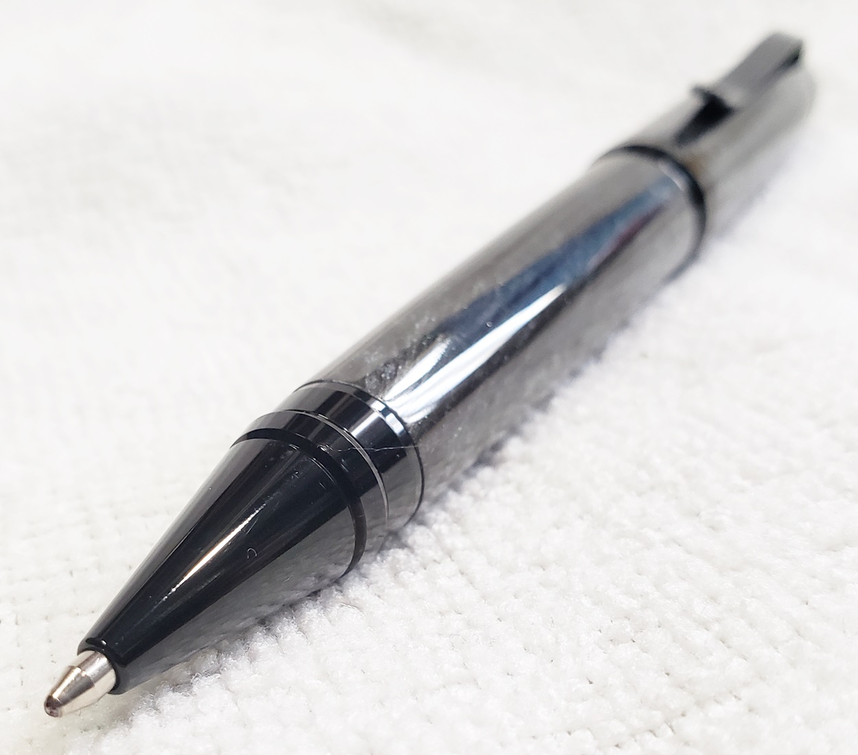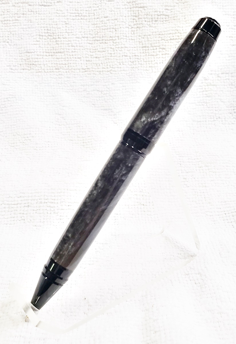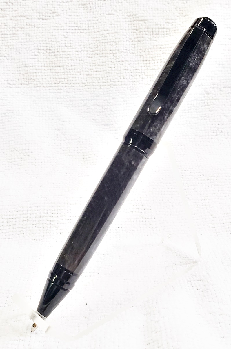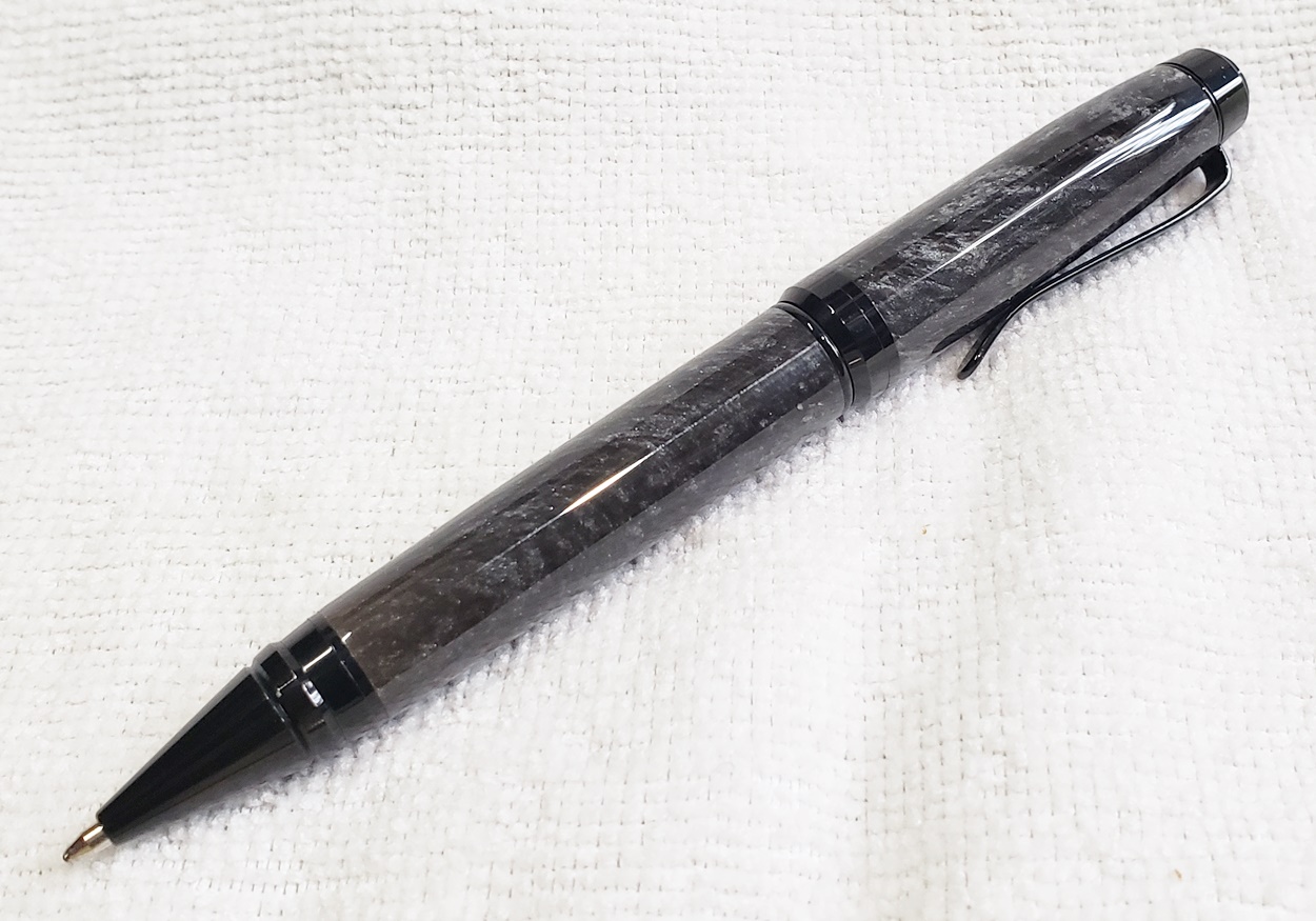 This is a cigar pen in bright black, from Woodcraft. The blank is a Rhino called Antique Silver. It's subtle, but I like it, especially with the black pen components. Very happy with it overall.
