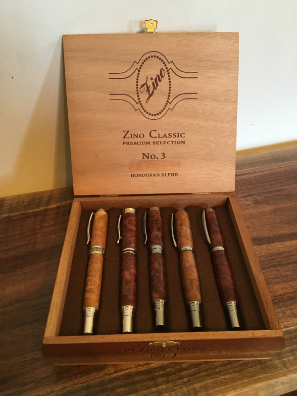 This is not an original idea by me. In fact, I may have gotten the idea from this forum or another forum. A particularly great way to display cigar pens. I placed some felt down in the bottom, but it could definitely be improved so the pens don't roll around. Maybe a foam base with partitions.