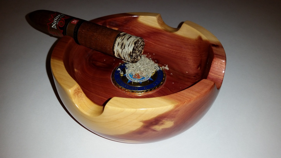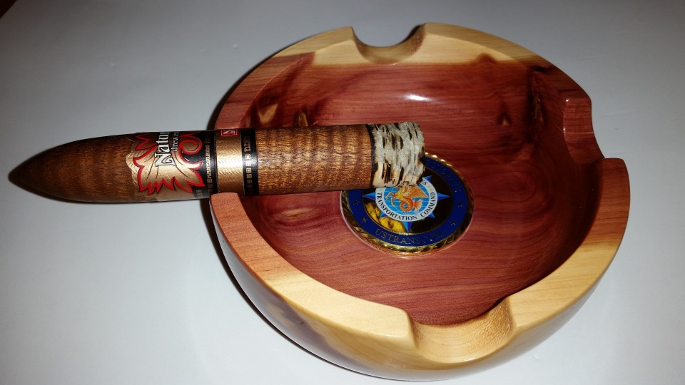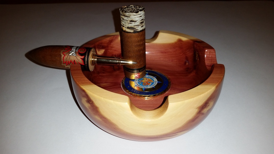 Another cigar deception pen made for a customer leaving for a new job it has his command coin in the middle of the ashtray. Cigar is made of mahogany and ashtray is made of eastern red cedar.