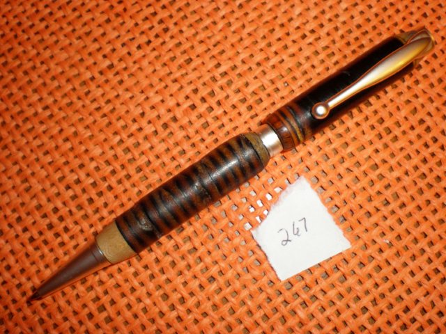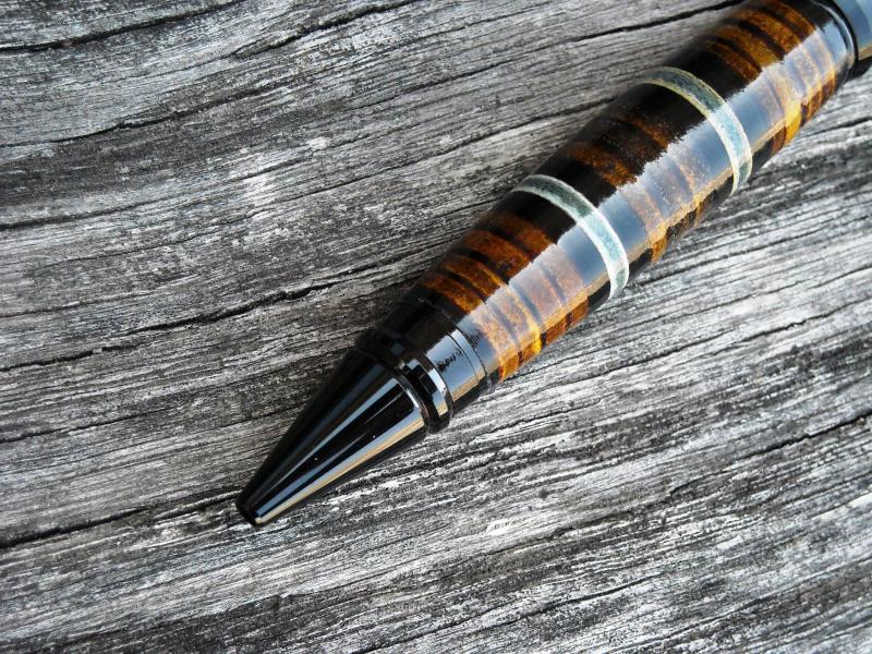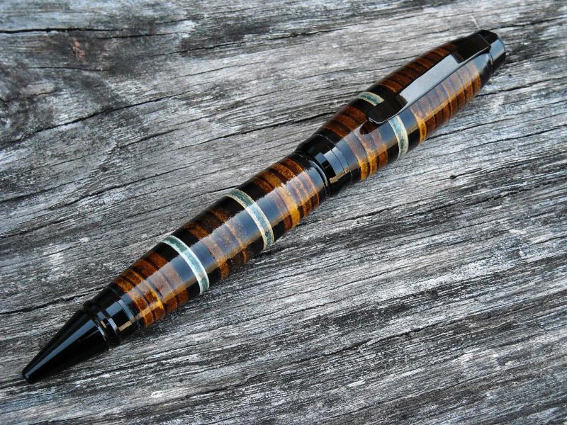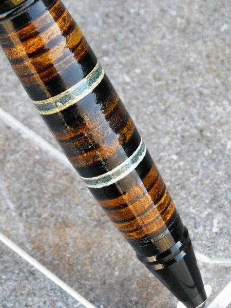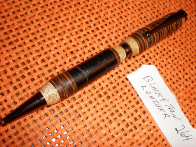 I only used medium CA and started building the layers just a few at a time. I did start about ¼" from the ends and anchored my first layer there. That way I could go back and fill in the ends as necessary. On most of the layers I used just a simple 12 inch bar clamp, one pad against the end of the tube, and the other pad pressured against a ½" or so i.d pipe that was compressing the layers uniformly around the tube. Does that make sense? Once completed, I soaked (and I mean "soaks till it drips") :biggrin: with thin CA and shots of accelerator. When I felt that all layers had soaked in enough CA, I trimmed the edges on a sander, and started turning with a small spindle gouge, the woodchuck, and then final shaping with a skew. All the time I was doing this, I would stop the lathe on a constant basis and if the leather looked "dry" I would soak and spray again. Once final shape was there, I sanded through 800-1200 and then coated it with BLO, and sanded again from about 600-1200 ( The BLO seemed to "raise" the leather somewhat like wood will do). After 8-10 coats of thin CA the first few and medium to finish it out this was the result.