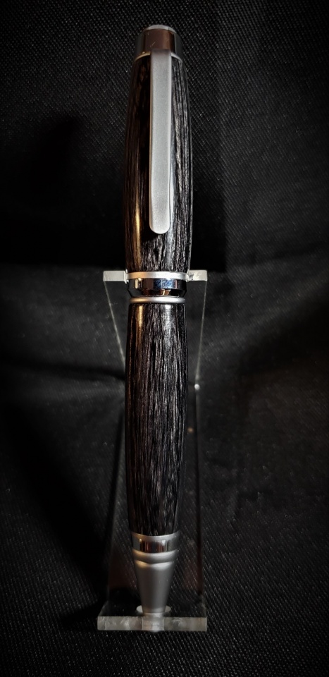 I believe this is a Berea cigar. I bought a bunch from Exotics - satin and chrome finish. The black/grain Dymondwood, bought from LarryC. Used Doctor's Workshop Pen Plus and micro abrasive wax. The Dymonwood really shines well on its own.