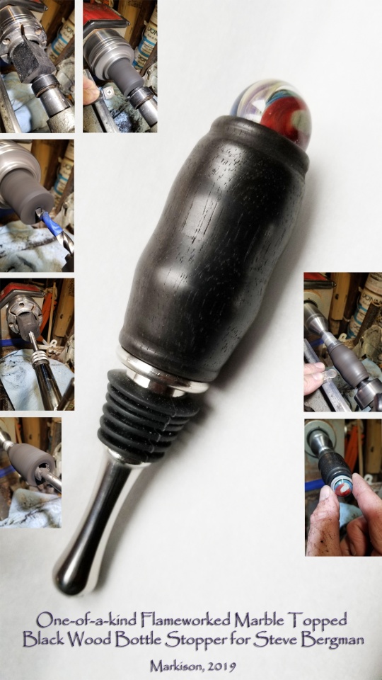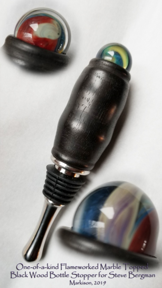 A fine professional clarinetist friend heard I was making flameworked marble topped stoppers and requested an African black wood (Dalbergia melanoxylon) clarinet barrel-shaped stopper.