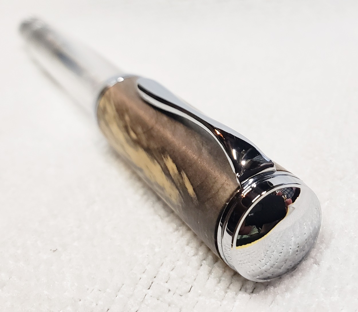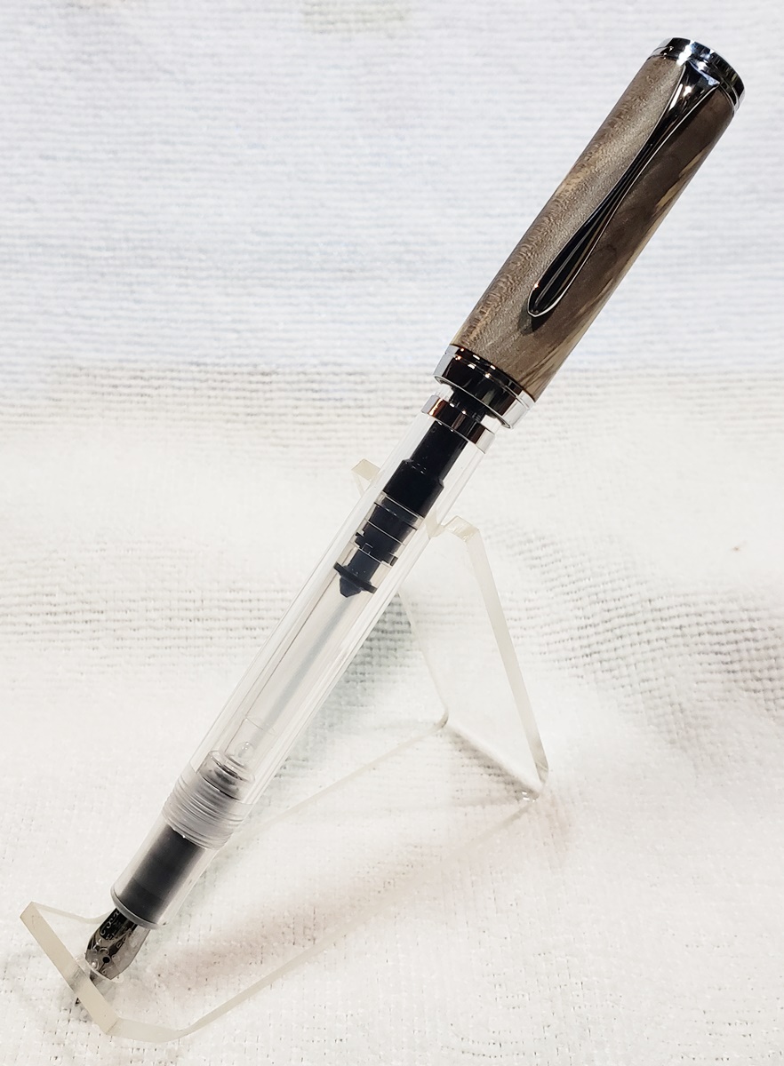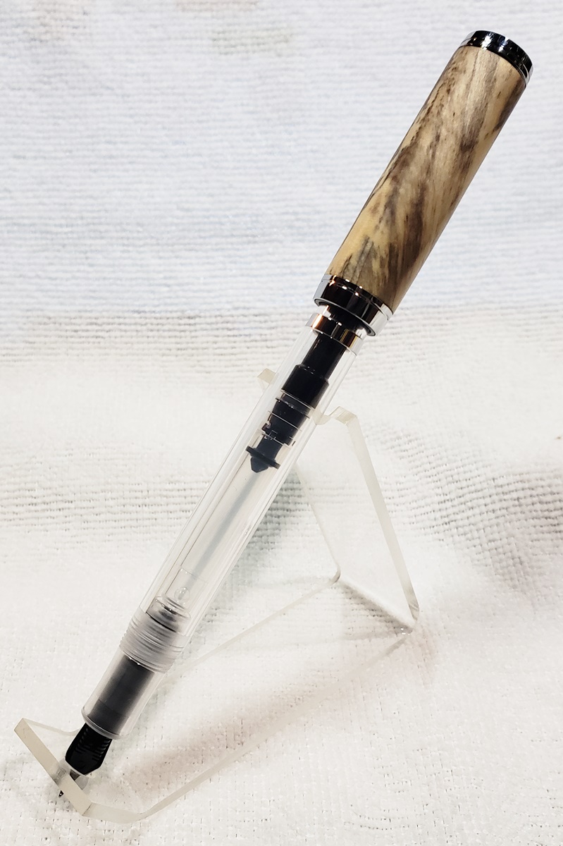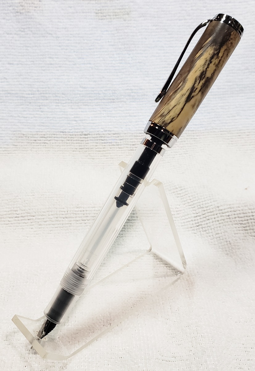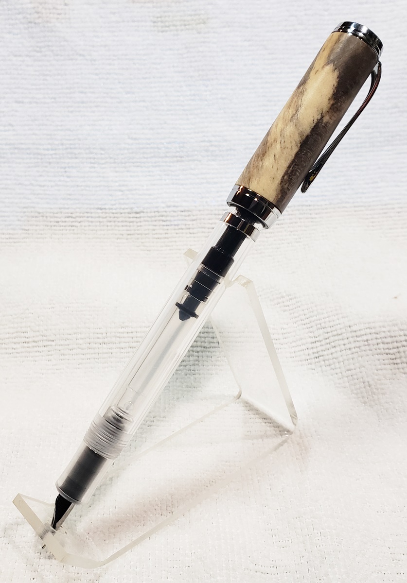 This is my first Clarion Demonstrator fountain pen, in chrome, from PSI. The blank is buckeye that I've had for years, and finally used. I think it was a freebie I got from Arizona Silhouette. All of the example pens on PSI's website have a bulge in the body. They look topheavy to me. I turned this body straight, and while the pen still looks topheavy, I do like the straight body better.