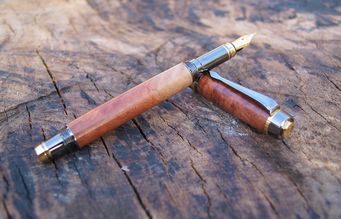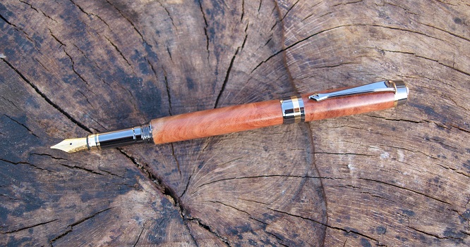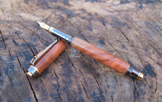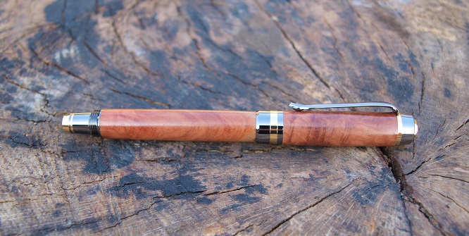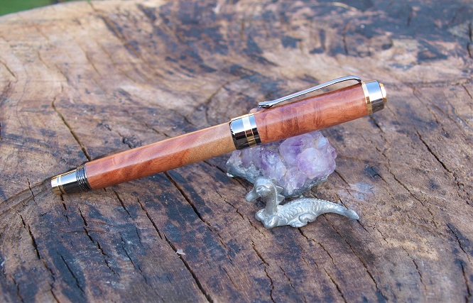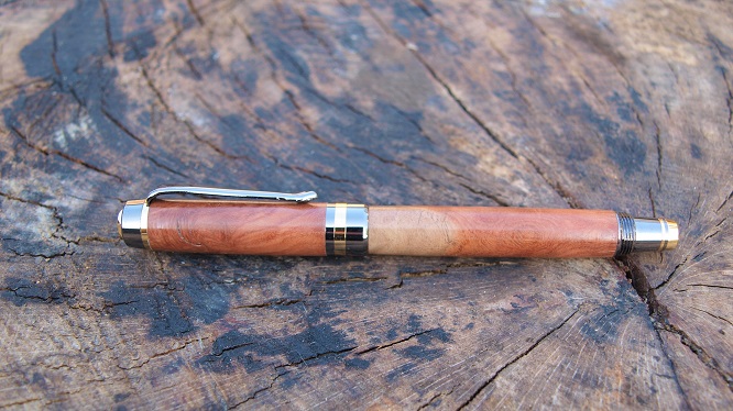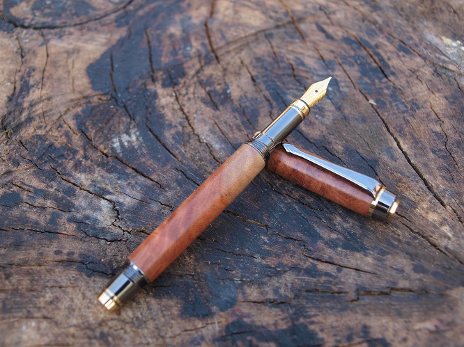 A Gunmetal & Gold Classic Elite 2 Fountain pen. Made using Australian Red Mallee. Really like this kit, only 10 mm tube, nice slim fountain pen. Finished with melamine lacquer & Renaissance wax.