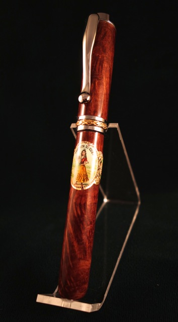 I've been intrigued lately with turning closed end cigar pens. This particular rollerball pen was turned from a piece of redwood burl that had a nice figure that simulated tobacco. I enhanced the figure even further using boiled linseed oil. The vintage cigar band was wrapped around the pen and attached with CA glue, and then the entire pen was given numerous coats of CA finish in order to cover and protect the cigar band. The pen was then wet sanded with Micro Mesh up through 12,000-grit and topped off with StickFast CA Gloss polish.