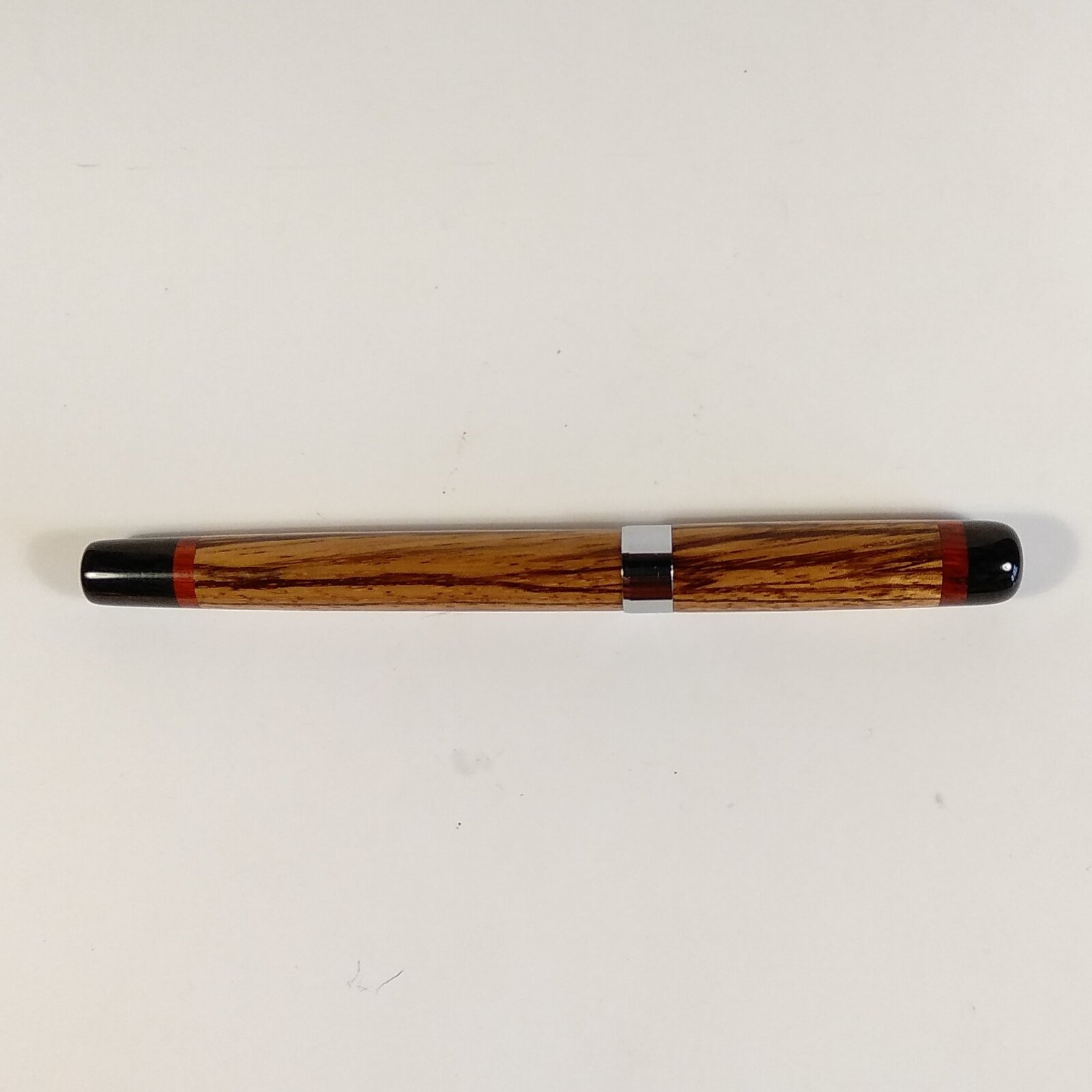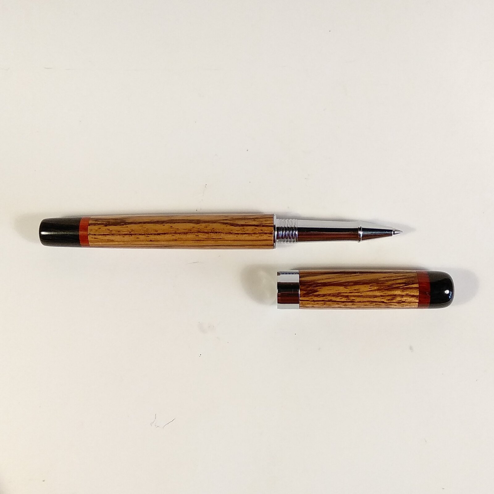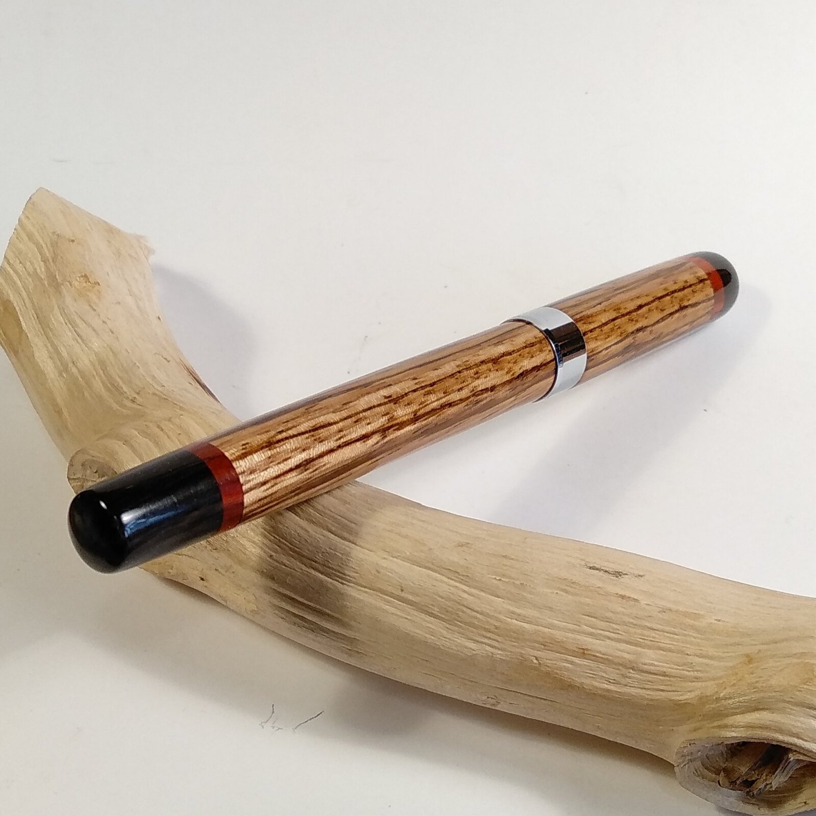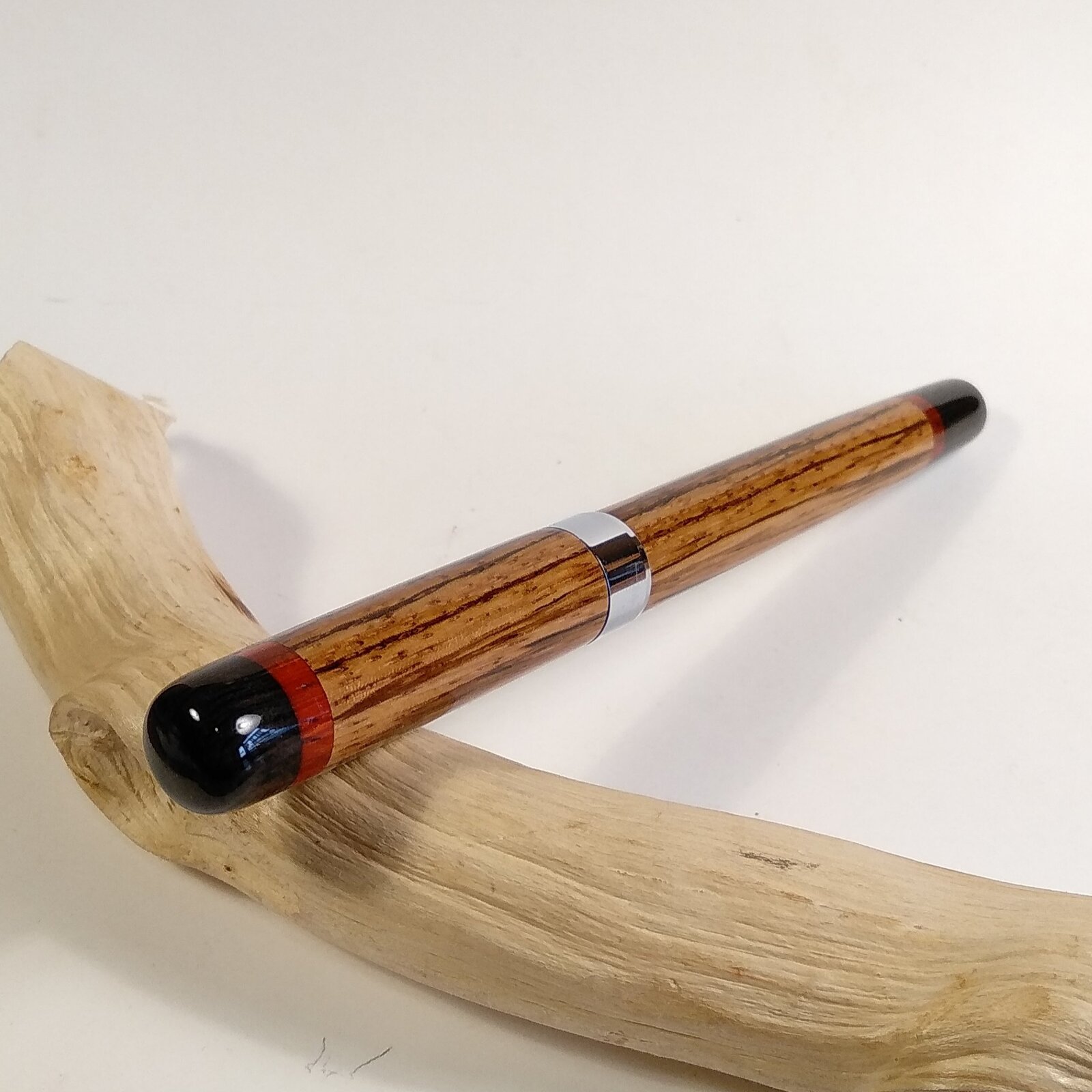 This is a first attempt for me to create a 'custom' roller (but can be converted to fountain pen) with double closed end. Clipless and non postable. Zebrano, padauk and ebony wood. 153mm long, 37g of weight in roller configuration.