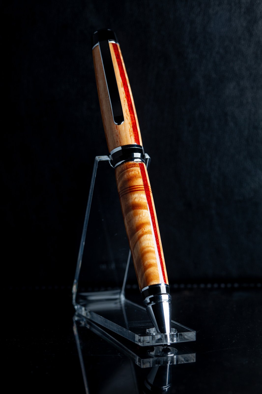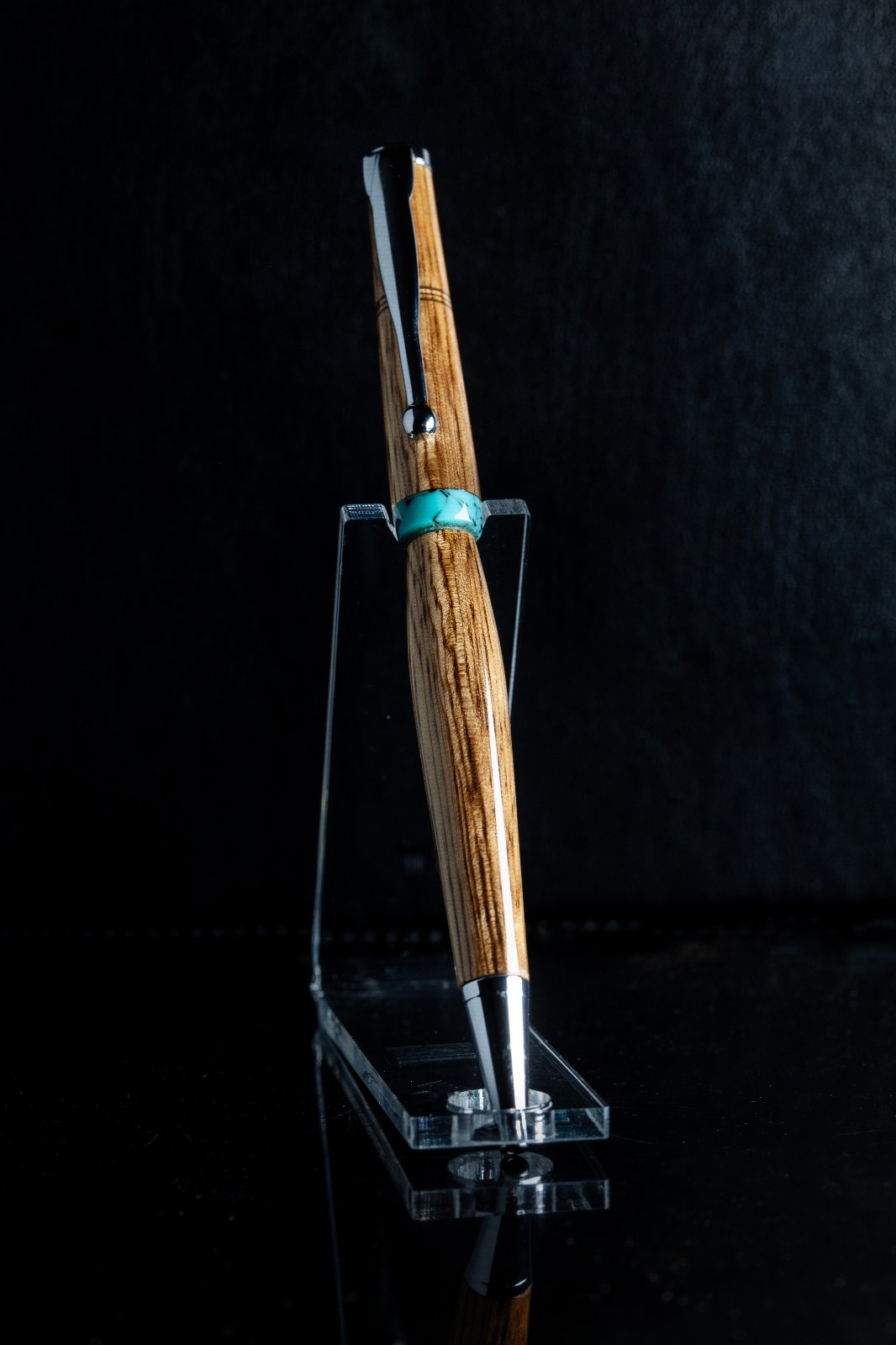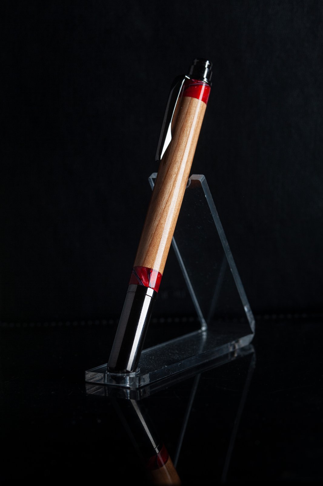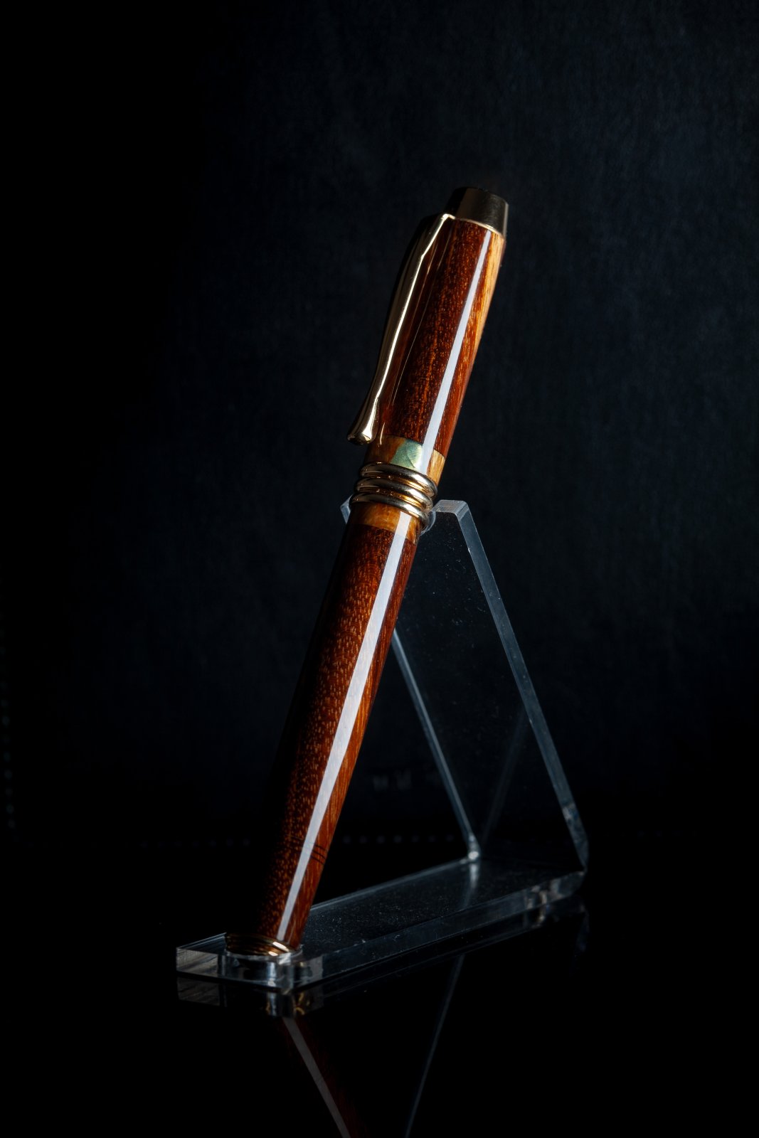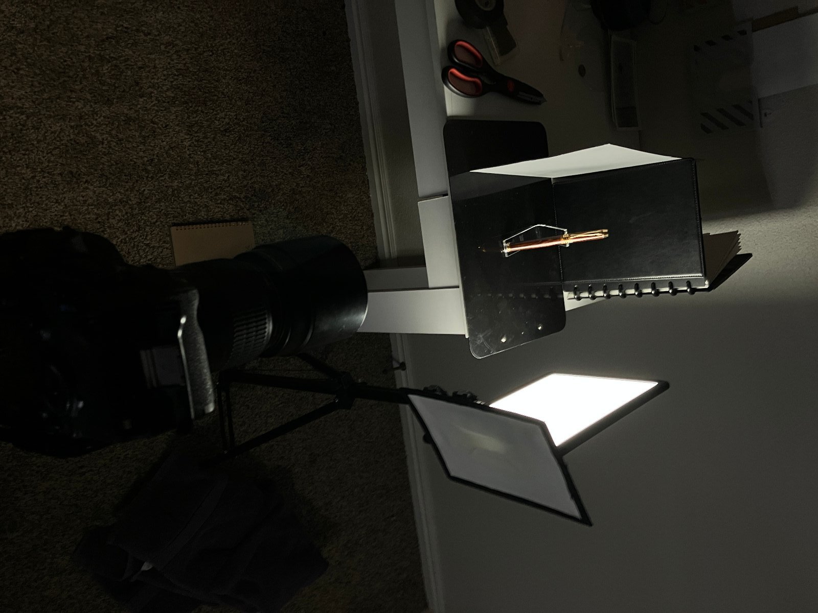 Setup photo. Notice reflective black plastic base to sit on, matte black leather background (a notebook I had handy). Light coming from the right - as close as I could get it without being in the frame, to make it maximally soft. To the left of the pen a regular sheet of white printer paper to act as a reflector, and bounce back some of the light onto the left side of the pen so the contrast between the right and left wide wouldn't be as dramatic. The light source angled away from the background to keep light off of it and let the background stay dark. The flag on the left side of the light source primarily to stop light from shining directly into the lens and causing a flare. Sorry for the rotation of the photo. The forum doesn't seem to have a way to set the orientation.