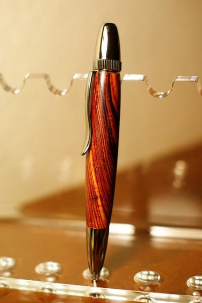 Hot off the lathe, its the first Atlas I have made and it turned out pretty good. The picture doesnt do it much justice. I chose a Black Titanium kit and a Cocobolo blank, it is sanded to 600 grit and has 3 coats of EEE and Huts Crystal Coat.